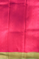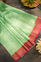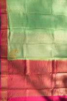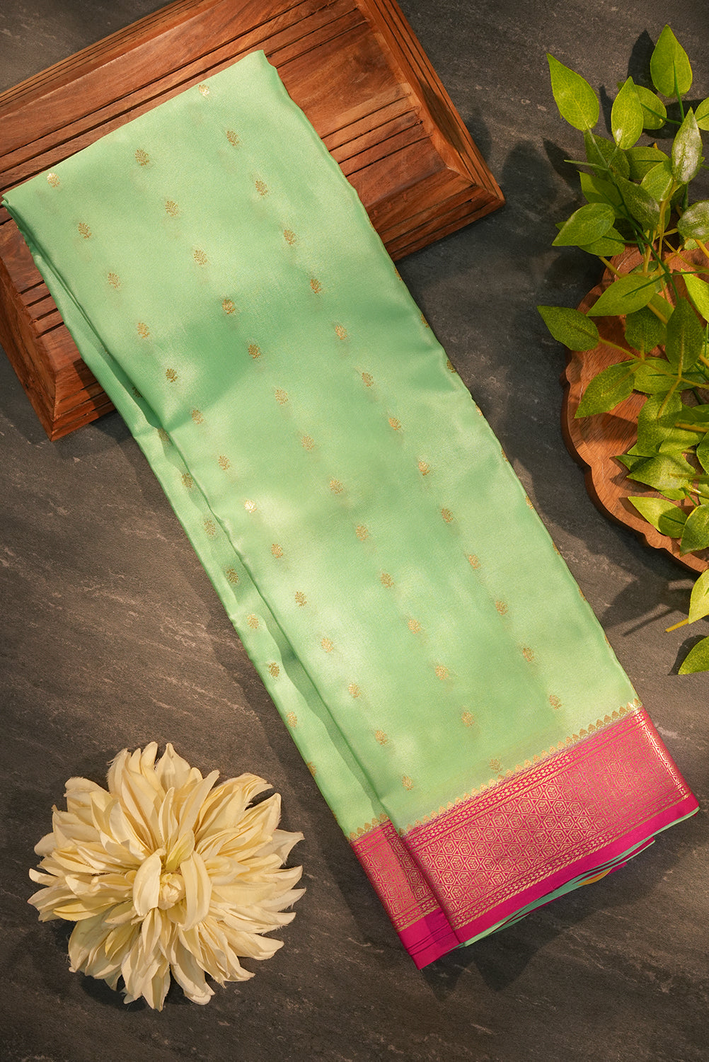 A refreshing mint green body adorned with delicate gold zari motifs. This authentic Mysore silk saree features a striking contrast magenta pink border with intricate geometric zari weaving, offering a lightweight and graceful drape. Unstitched blouse attached.