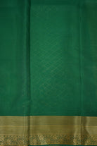 This exquisite Mysore silk saree features a sophisticated mix of colors, with stripes in soft off-white, light green, and peach. The body has a subtle woven checkered pattern, adding a touch of texture. The saree is finished with a stunning golden zari border and a solid dark green edge, providing a beautiful contrast. This lightweight and luxurious saree is perfect for festive occasions and special events, offering a modern twist on a classic design.