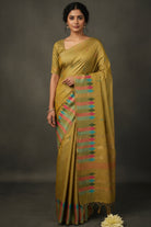 Experience the perfect blend of tradition and contemporary style with this mustard yellow soft silk saree. The saree's simple elegance is elevated by its eye-catching border, which features a bold zigzag pattern in shades of blue, pink, and green. Unstitched blouse attached.