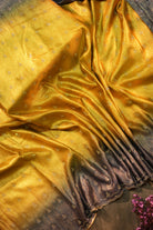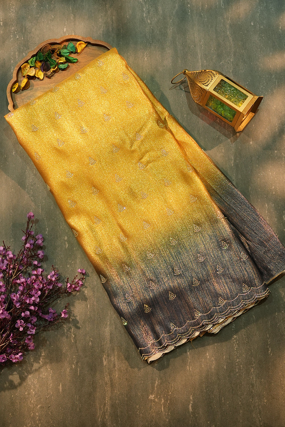 Radiant and sophisticated, this dual-tone saree features a seamless ombre transition from a sun-kissed mustard yellow to a deep charcoal grey. Adorned with delicate stone-work motifs and a meticulously crafted scalloped border, this piece is designed for high-glance appeal. The shimmering fabric texture adds a touch of luxury, making it perfect for evening receptions and festive celebrations. Unstitched blouse attached.