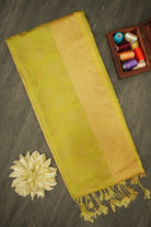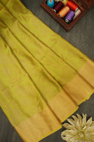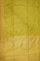 This stunning soft silk saree features a beautiful light olive green body, richly woven with intricate floral and fruit motifs. The pallu and border are a vibrant gold, also adorned with detailed zari designs, creating a rich and opulent look. This saree is perfect for weddings, festive occasions, and special events.