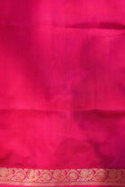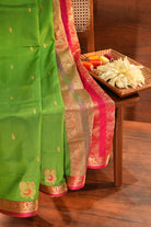 A vibrant parrot green saree featuring intricate gold zari buttas and large peacock motifs near the border. The rich gold zari border is finished with a delicate pink piping, making it a perfect choice for festive occasions and traditional gatherings. Unstitched blouse attached.
