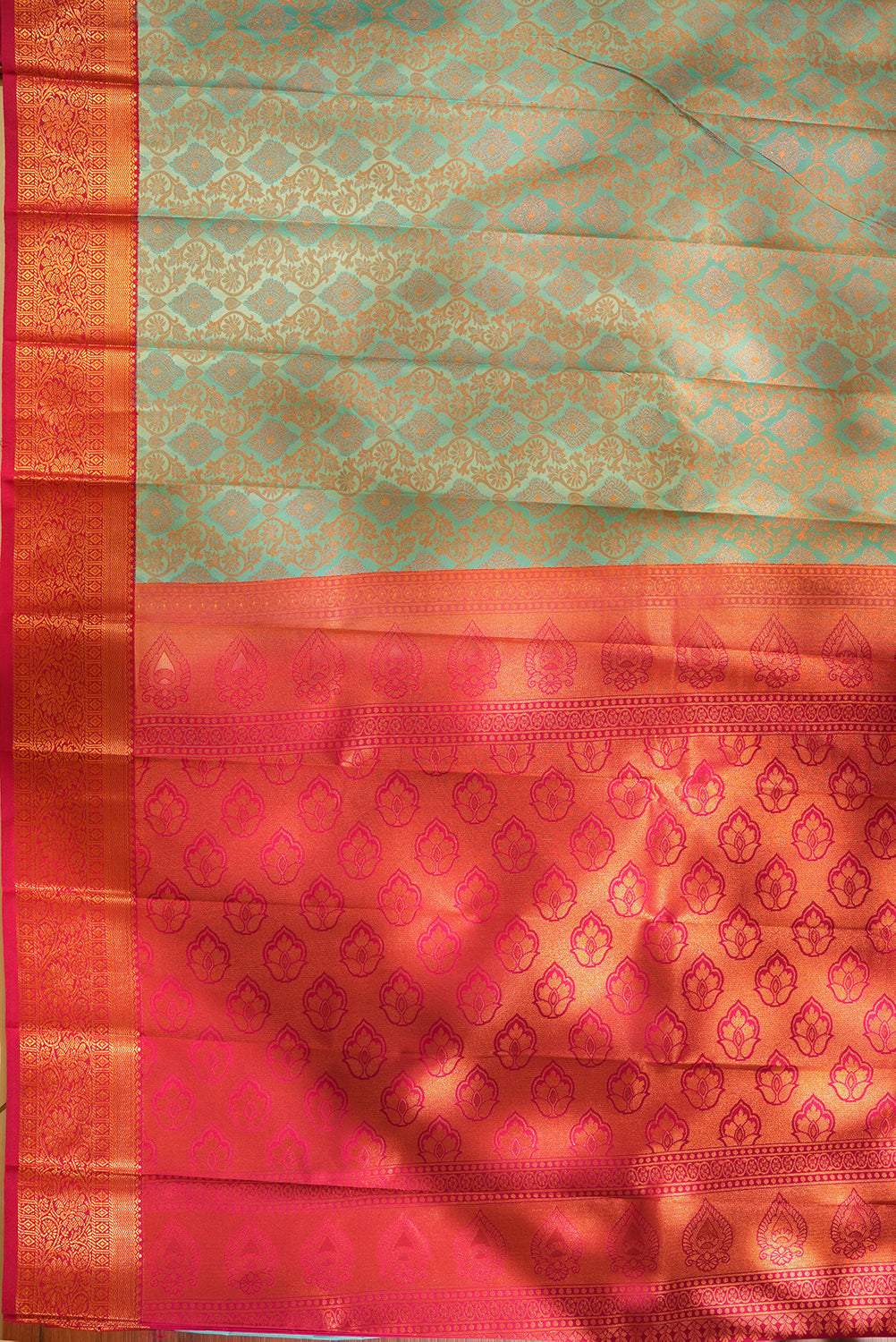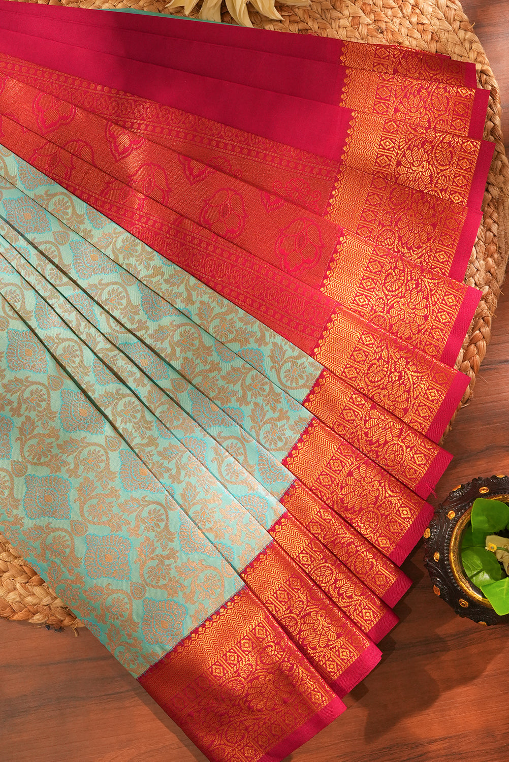 Step into elegance with this pastel blue saree, showcasing a lush all-over motif pattern. The striking magenta-pink border features heavy zari work in classic temple and geometric styles, making it an ideal choice for weddings and special celebrations. Unstitched blouse attached.