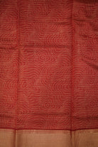 A stunning Tussar silk saree in a deep red shade, with an intricate floral print in a shimmery golden beige. The rich gold border complements the print, adding a touch of traditional elegance.