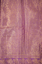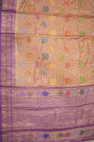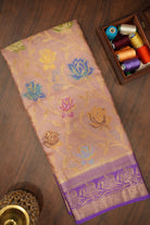 An enchanting rose gold Kanjivaram silk saree that exudes timeless elegance. The body is woven with intricate multicolored lotus motifs in shades of blue, yellow, and blush pink. The saree is beautifully contrasted with a rich purple border featuring detailed floral patterns and a gold zari weave. Unstitched blouse attached.