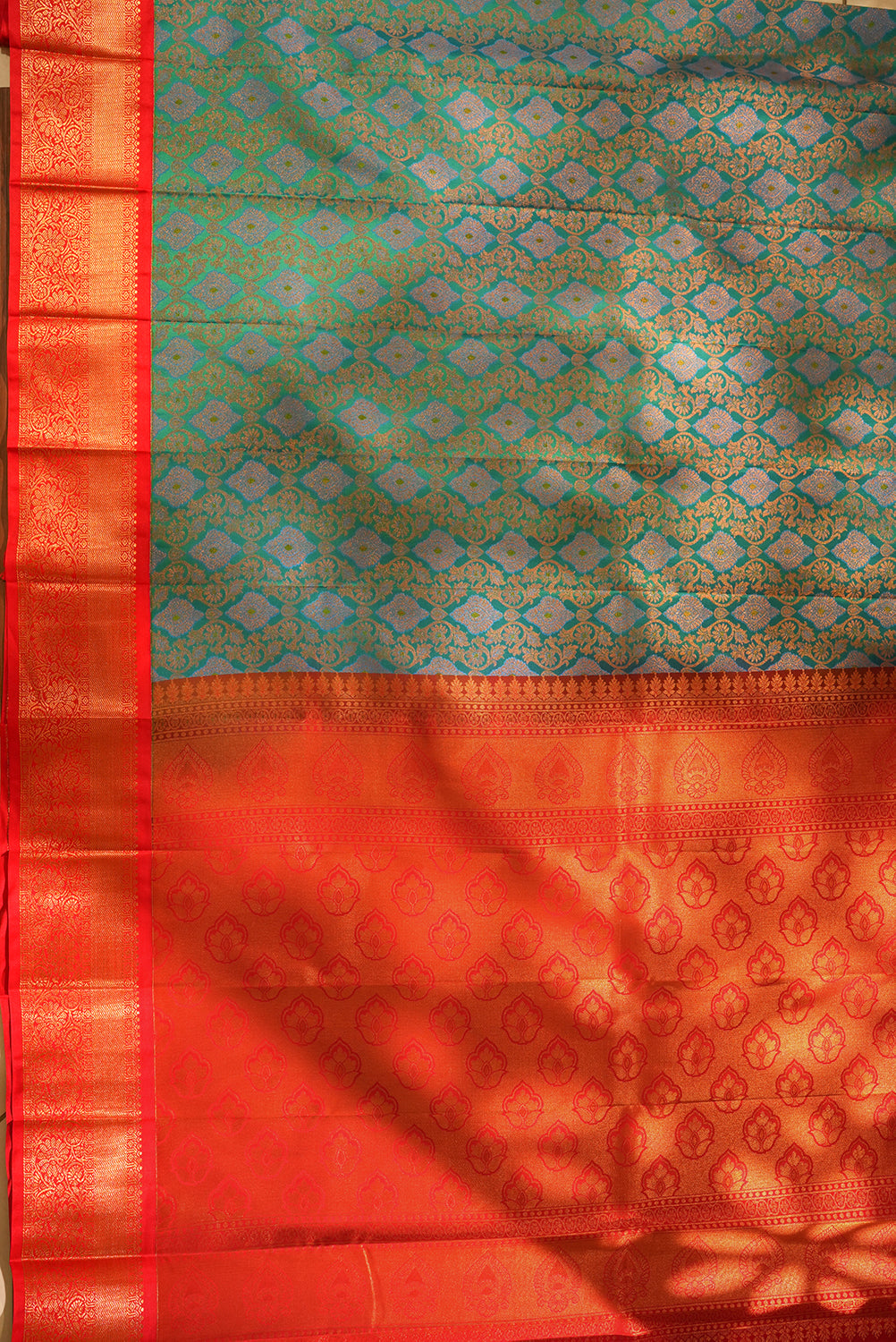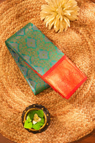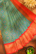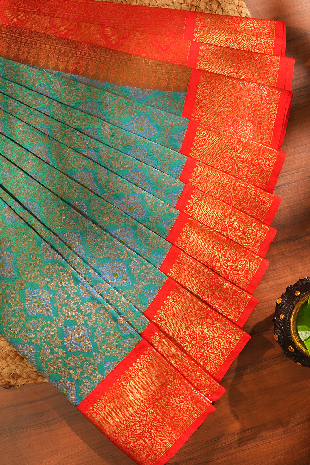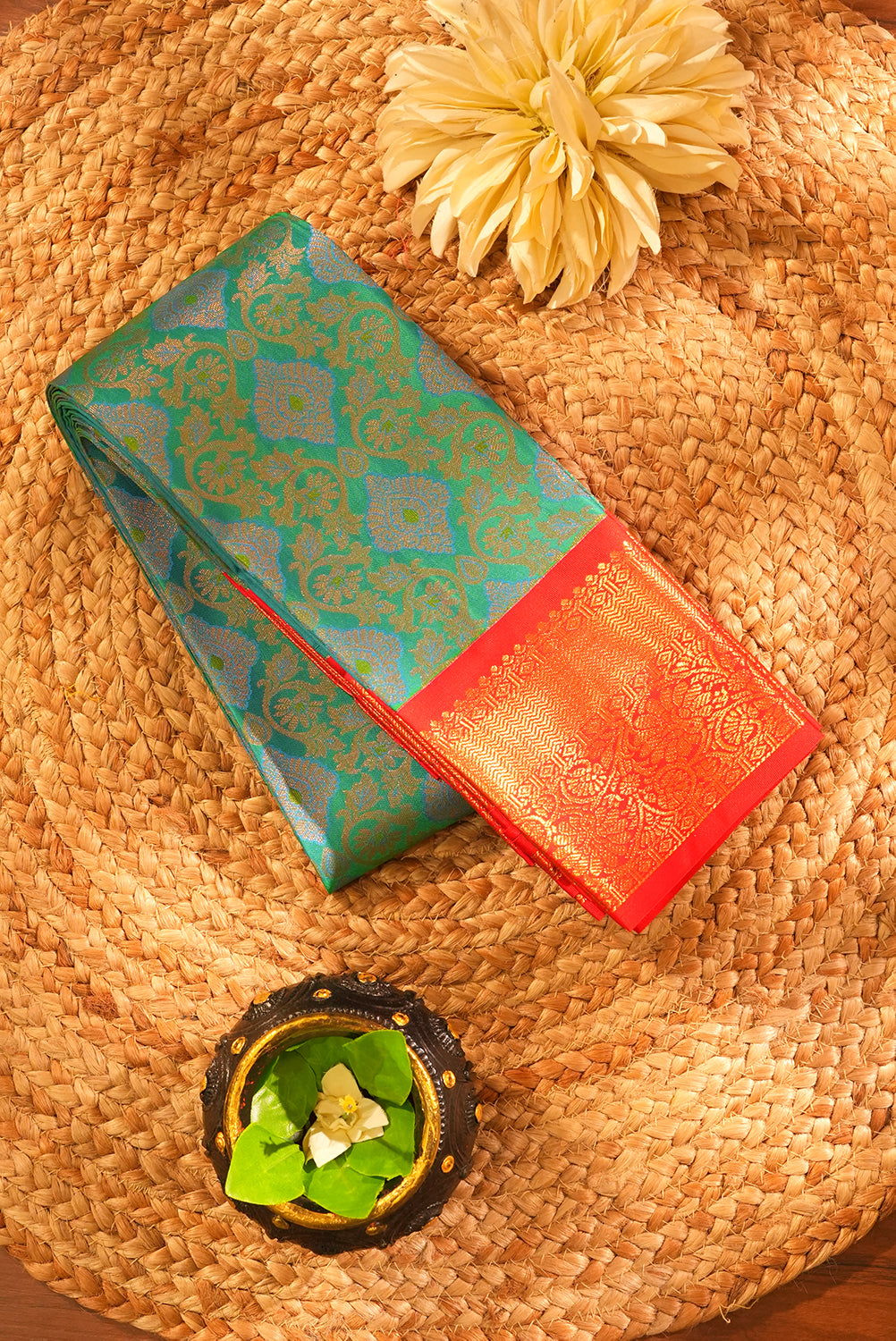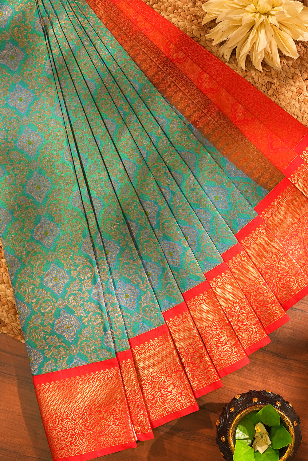 This regal silk saree features a mesmerizing sea green body with a subtle blue dual-tone sheen, adorned with an all-over floral and paisley jacquard pattern. The contrasting crimson red border is heavily embellished with gold zari work, perfect for grand weddings and festive occasions. Unstitched blouse attached.
