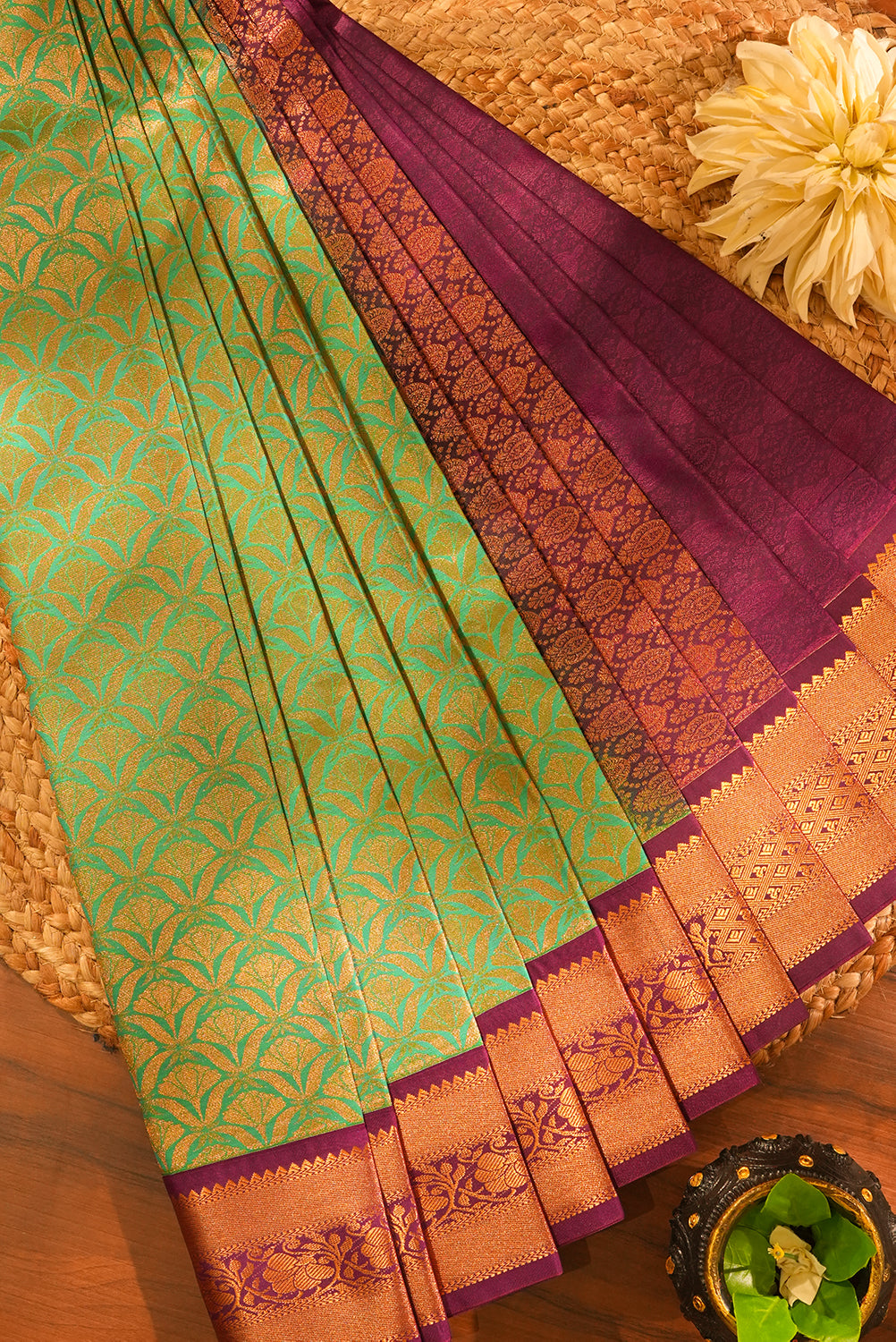 Radiant and regal, this Kanjivaram silk saree features a vibrant sea green body adorned with intricate gold zari buttis. The contrasting magenta border is richly woven with traditional floral motifs, making it a perfect choice for weddings and festive celebrations. Unstitched blouse attached.