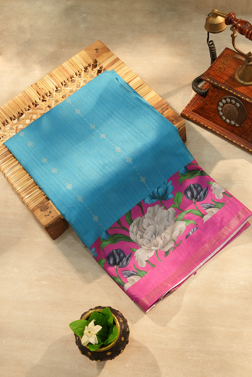 Embody grace in this stunning sky blue raw silk saree. The body features subtle self-stripes and delicate gold buttas, beautifully contrasted by a wide pink border adorned with oversized, artistic floral blooms. Perfect for festive gatherings and elegant evening wear. Unstitched blouse attached.