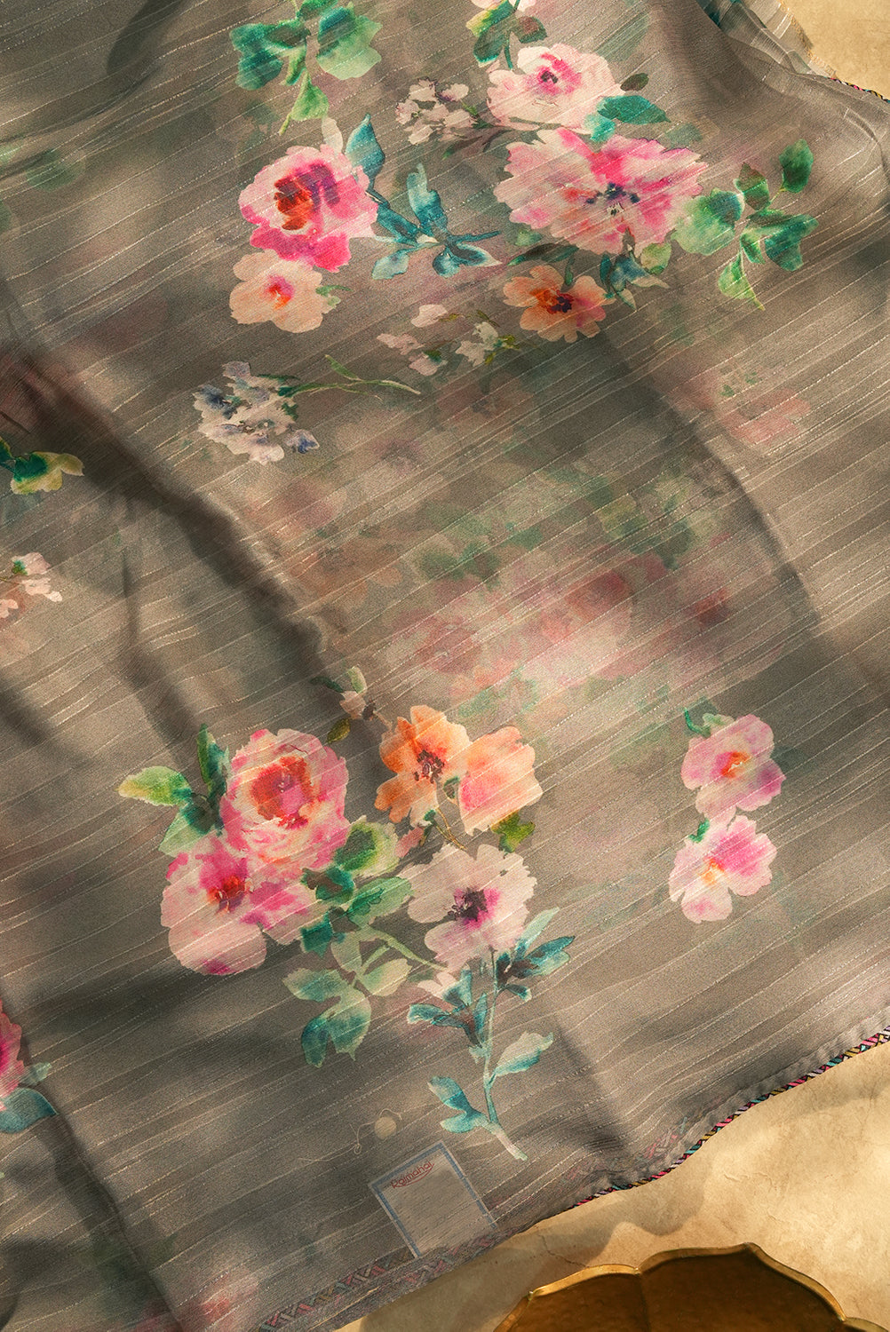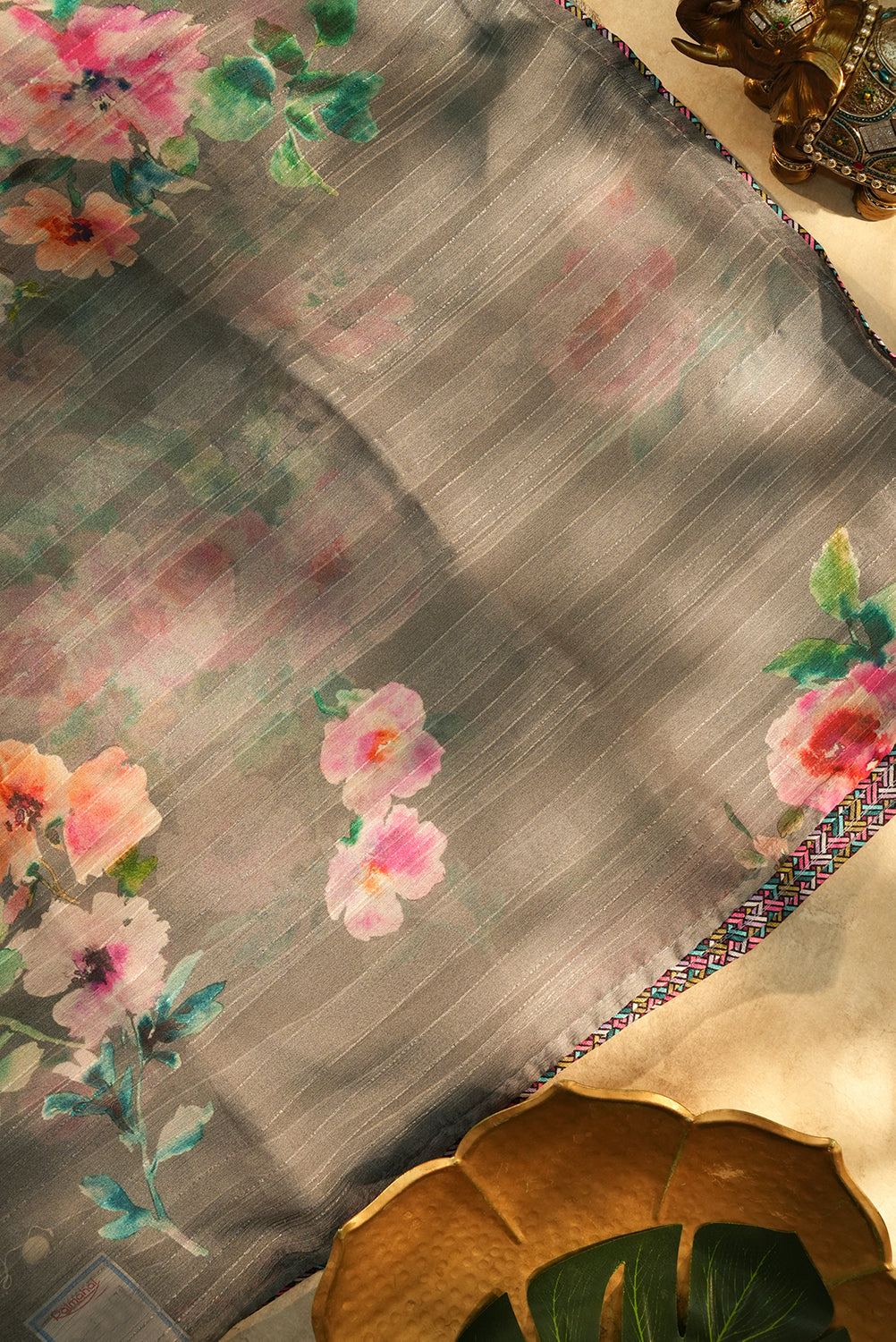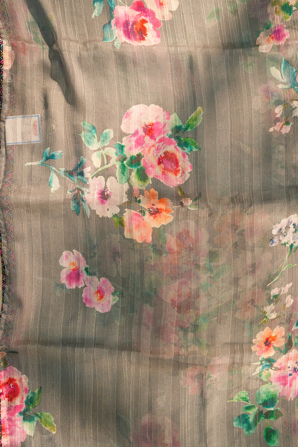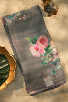 A sophisticated slate grey chiffon saree featuring subtle horizontal metallic stripes for a touch of shimmer. It is adorned with large, watercolor-style floral bunches in shades of blush pink and peach with teal-green foliage, finished with a sleek multicolor geometric border. Unstitched blouse attached.