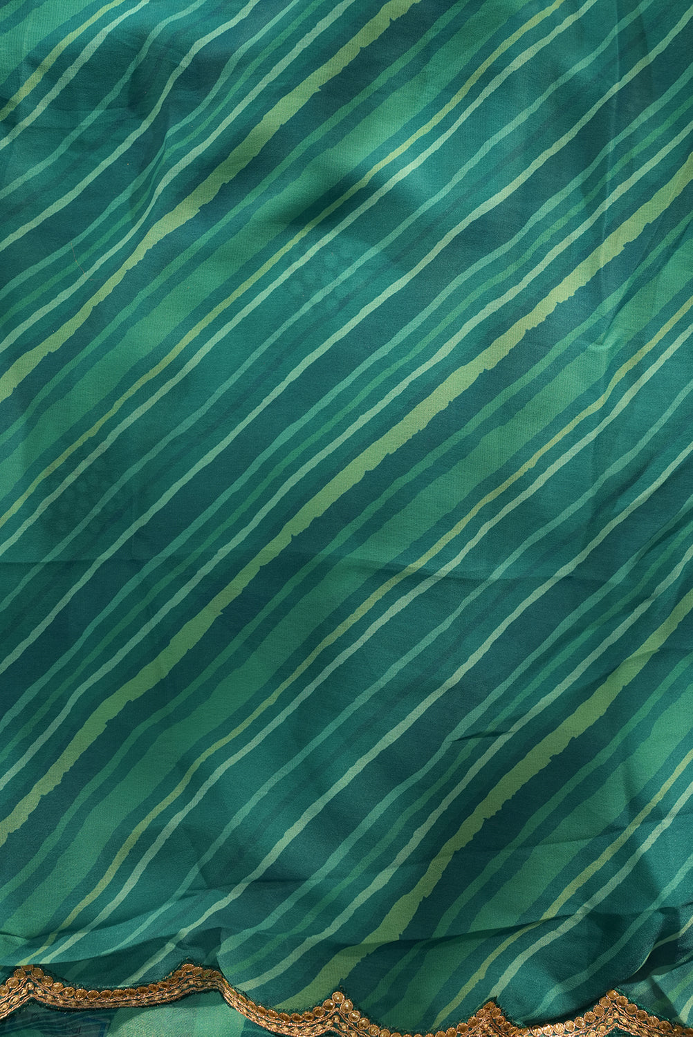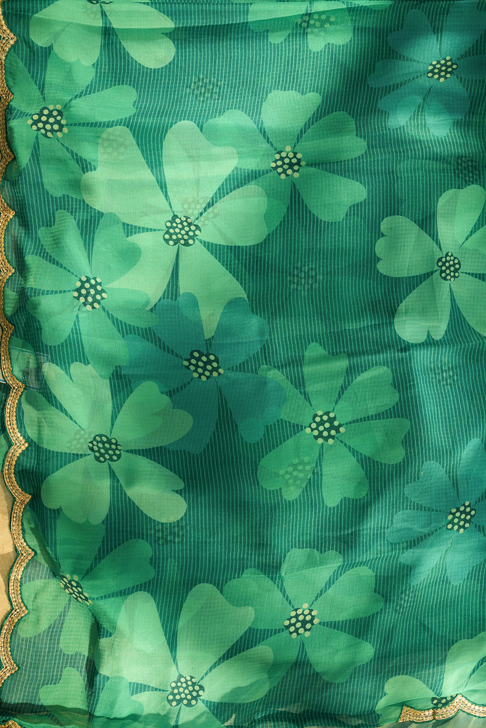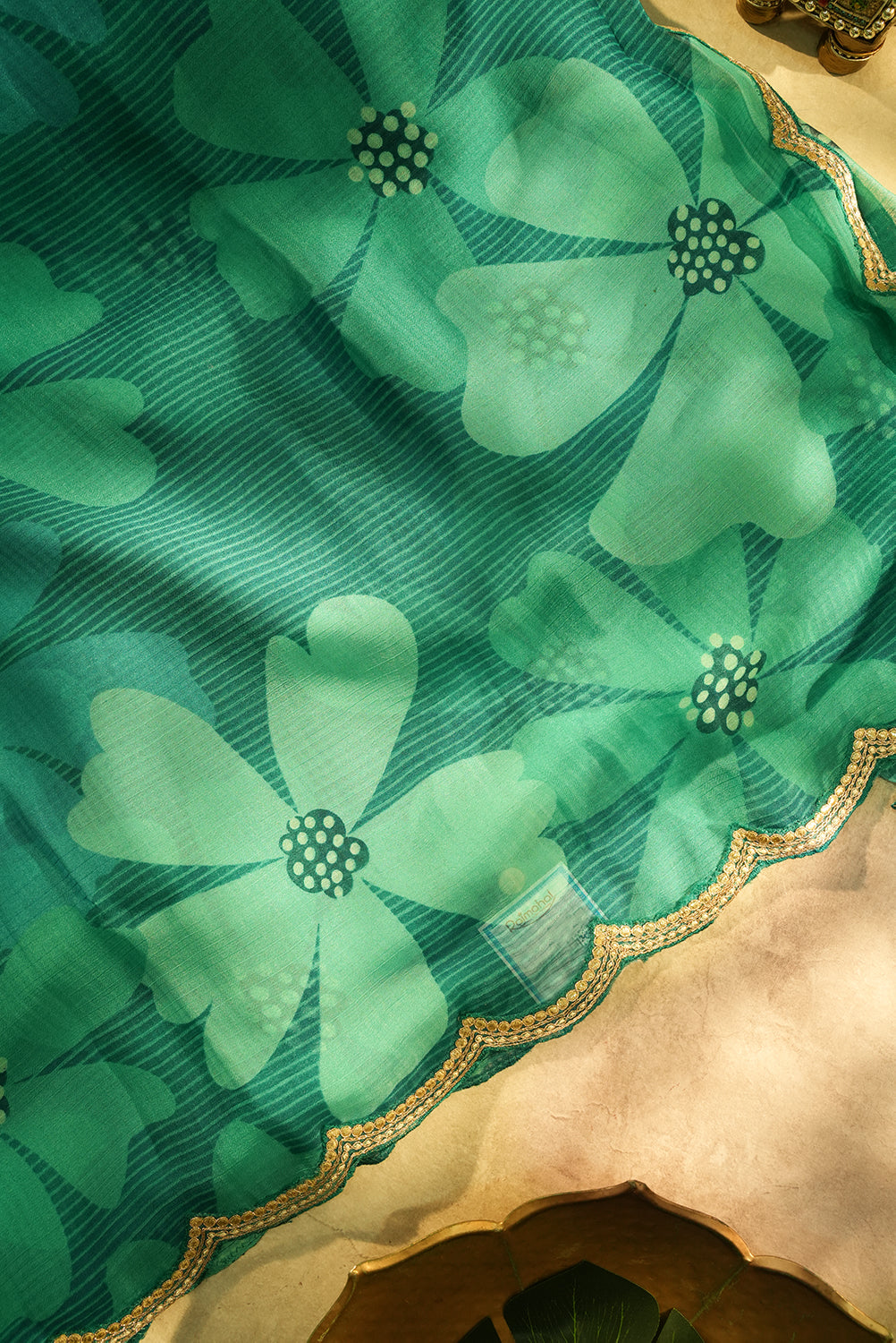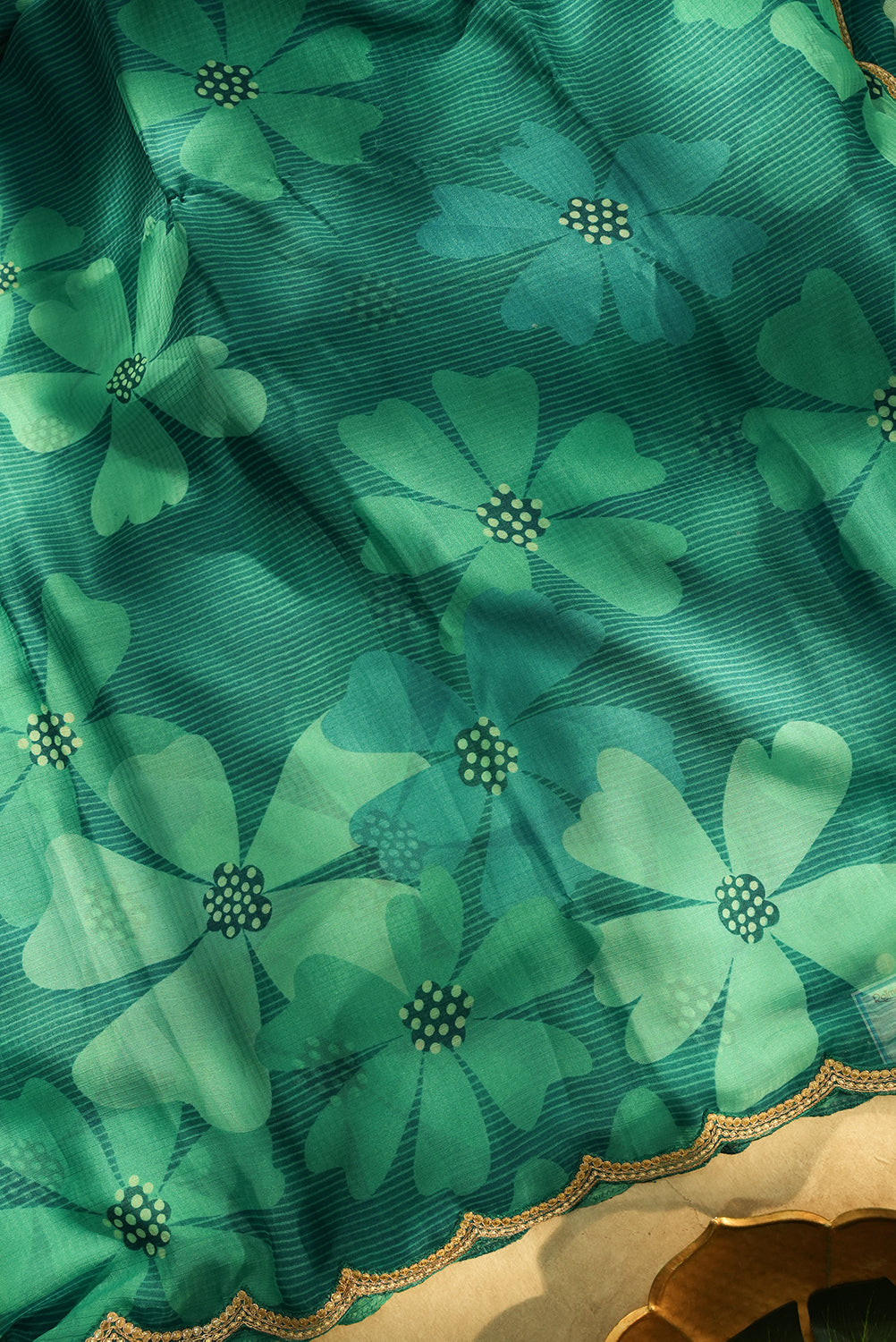 This lightweight chiffon saree features a lovely dual-tone teal and sea-green palette with large, breezy floral motifs. It is finished with a trendy gold-embroidered scalloped hem, adding a touch of sophistication to the drape. Unstitched blouse attached.