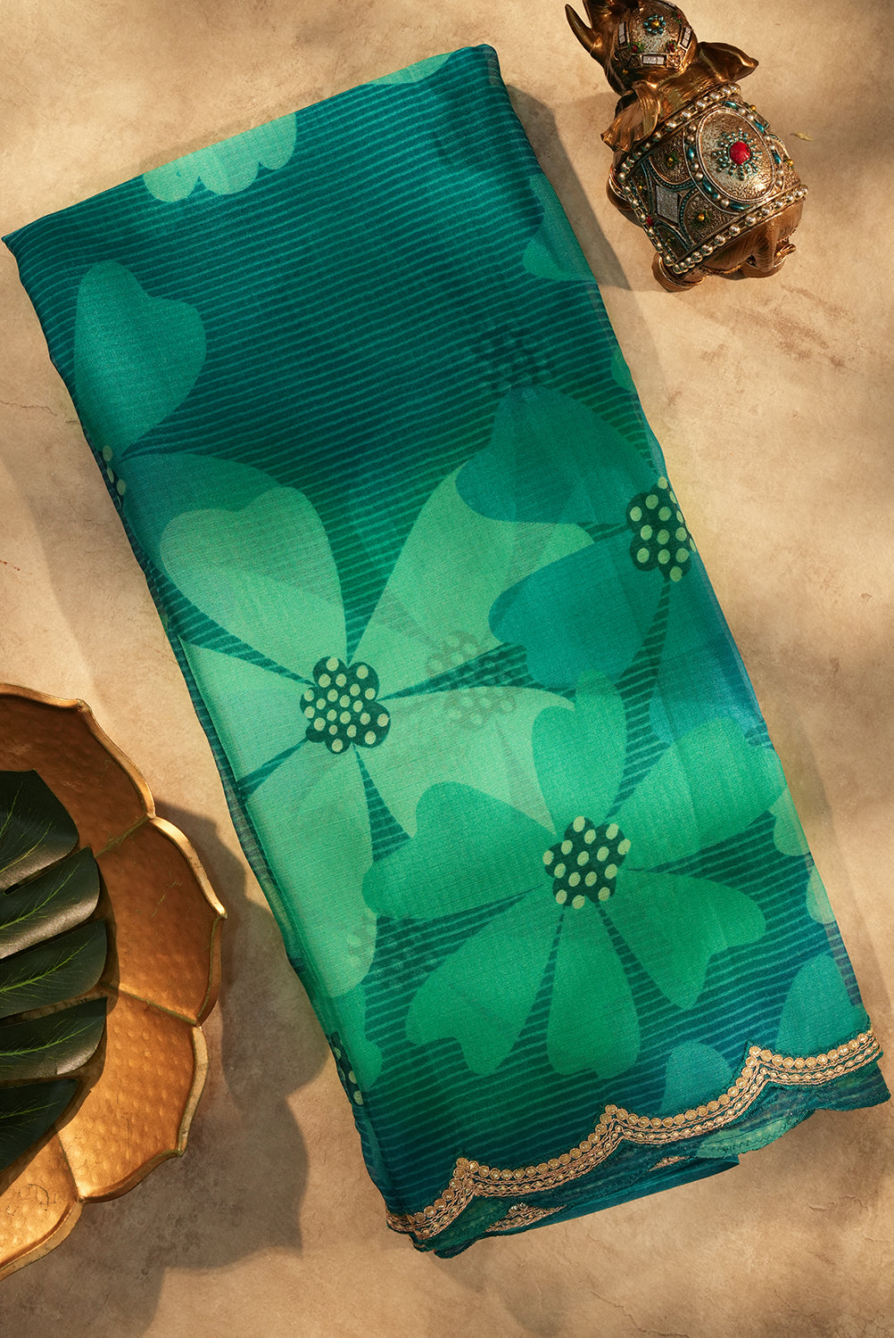 Teal Green Floral Chiffon Saree