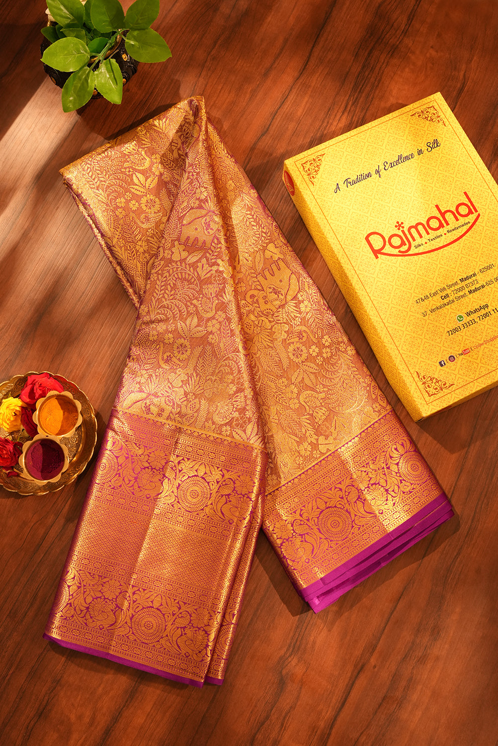 Drape yourself in luxury. This dual-tone masterpiece combines the richness of antique gold with a vibrant purple border. Detailed with traditional "Yanai" (elephant) and floral patterns, it’s a celebration of Indian craftsmanship. Perfect for the modern bride or any special occasion. Unstitched blouse attached.