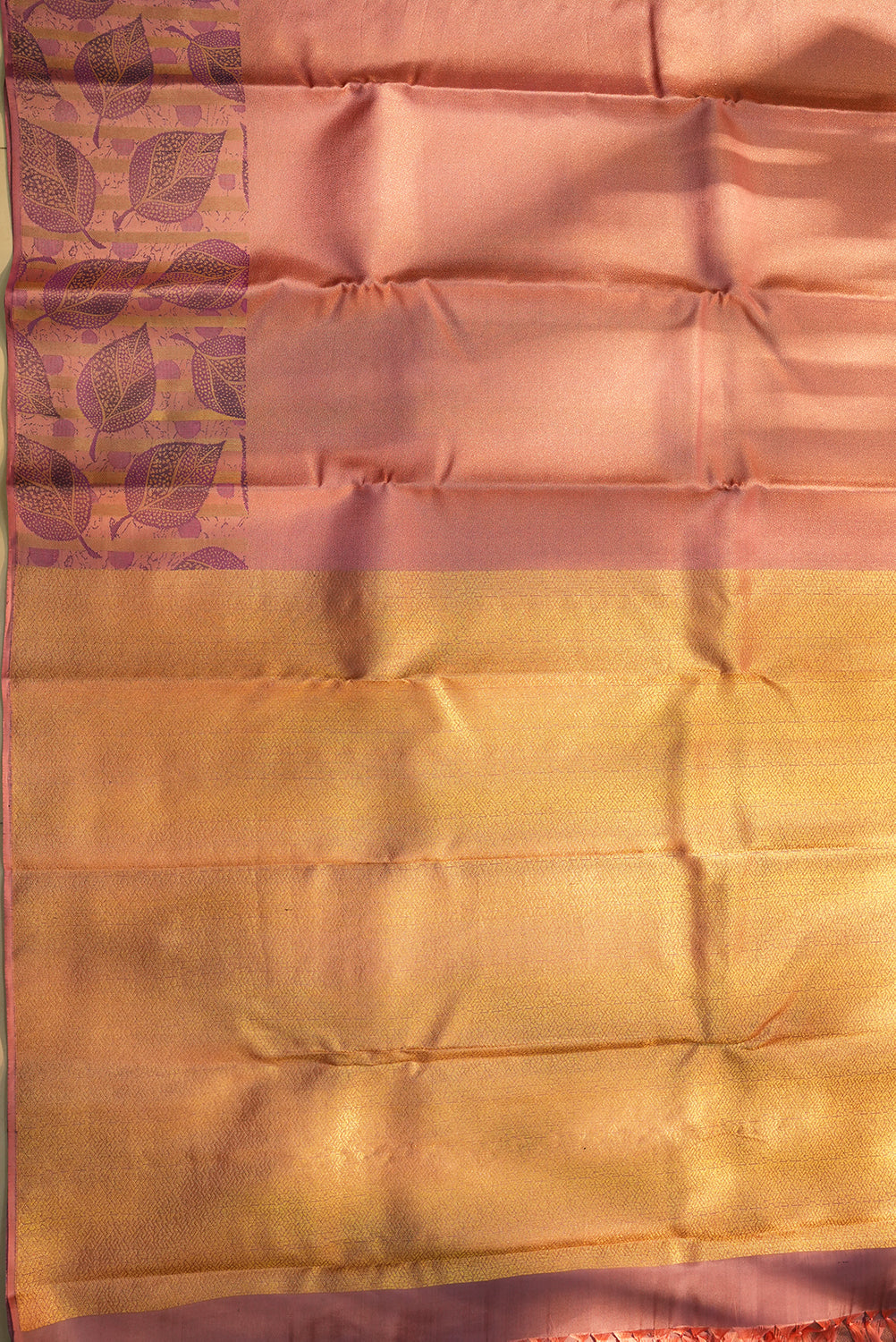 Embody timeless grace with this exquisite silk saree featuring a delicate dusty rose body adorned with intricate purple leaf motifs. The highlight is the broad, shimmering mustard-gold zari border that adds a royal touch, making it perfect for weddings and festive celebrations. Unstitched blouse attached.