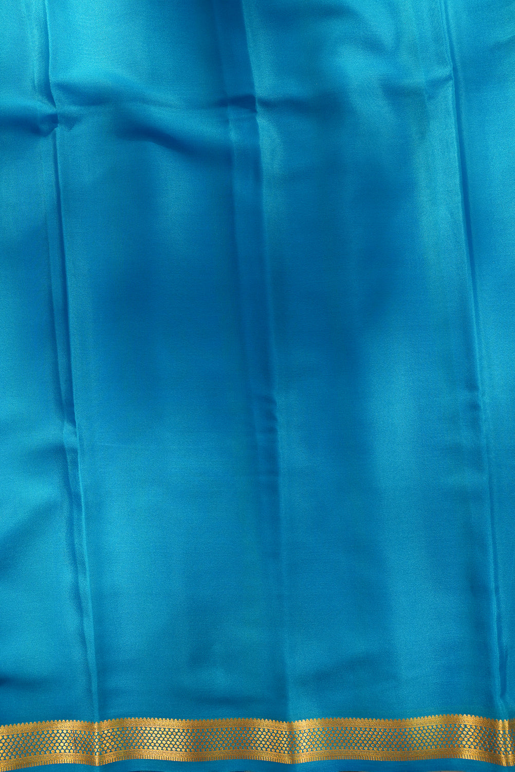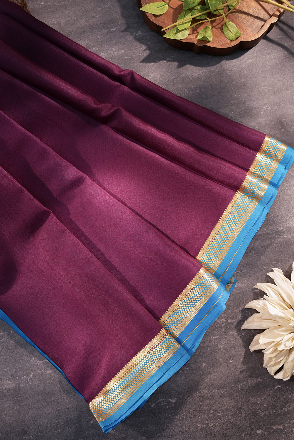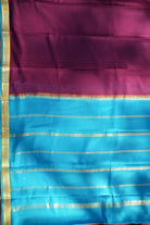 Lightweight and lustrous, this Mysore silk saree features a classic wine-purple body contrasted by a bright sky blue and gold zari border. A perfect blend of traditional elegance and modern color aesthetics. Unstitched blouse attached.