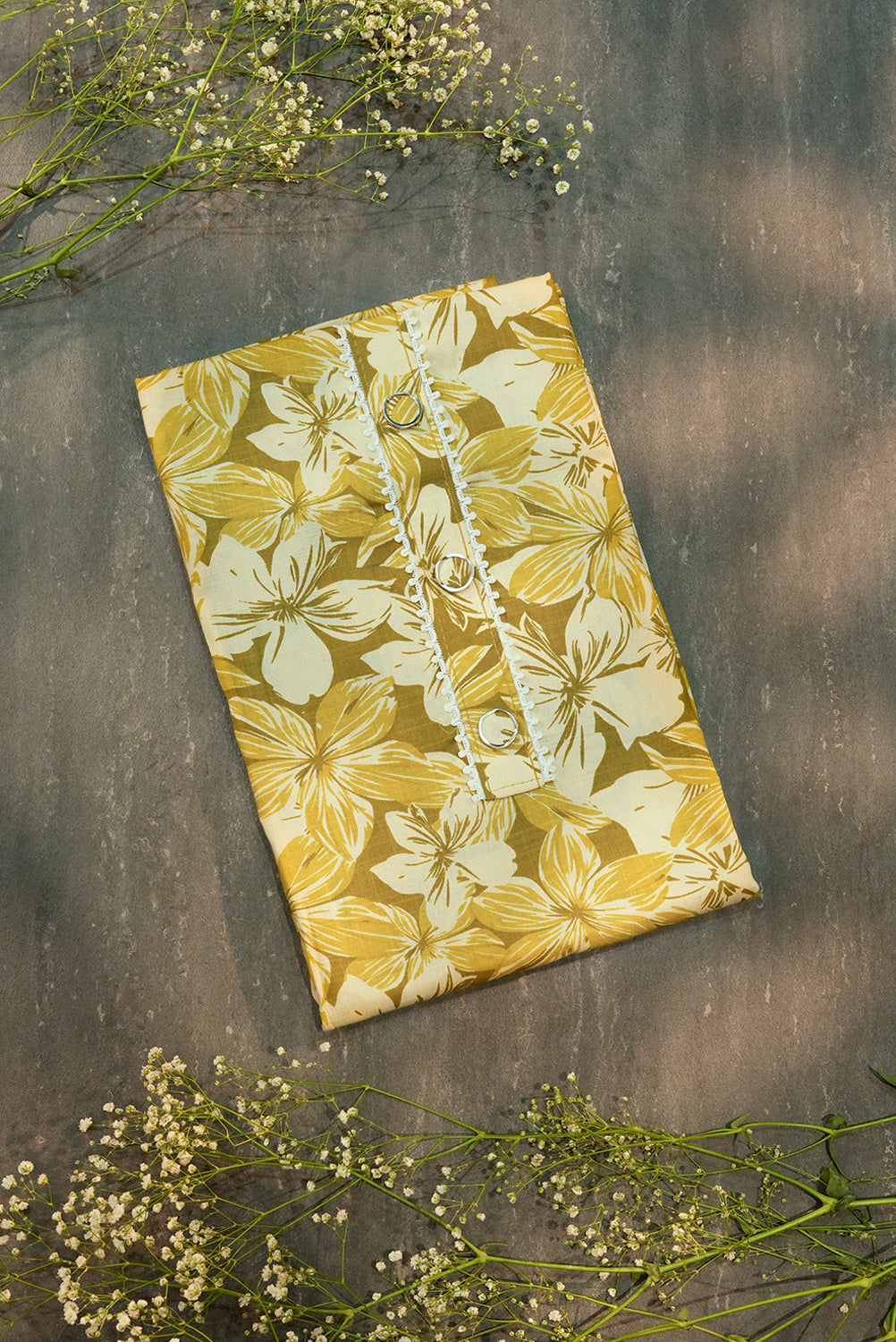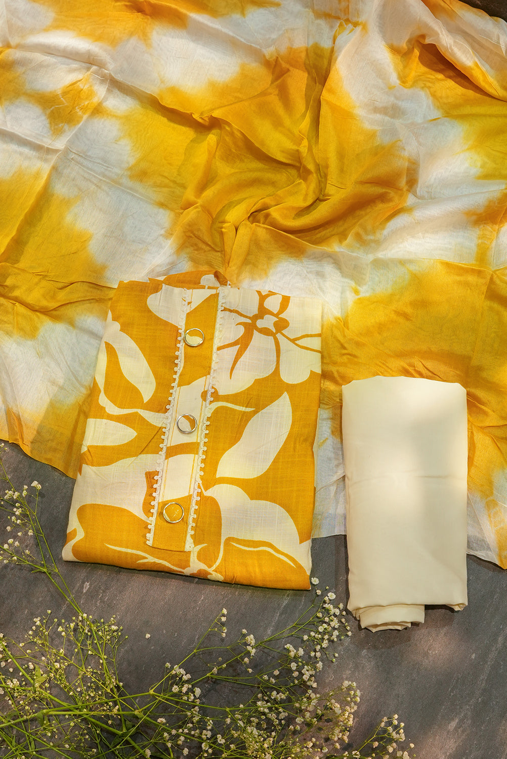 Mustard Floral Unstitched Salwar Set with Mirror Work Detail