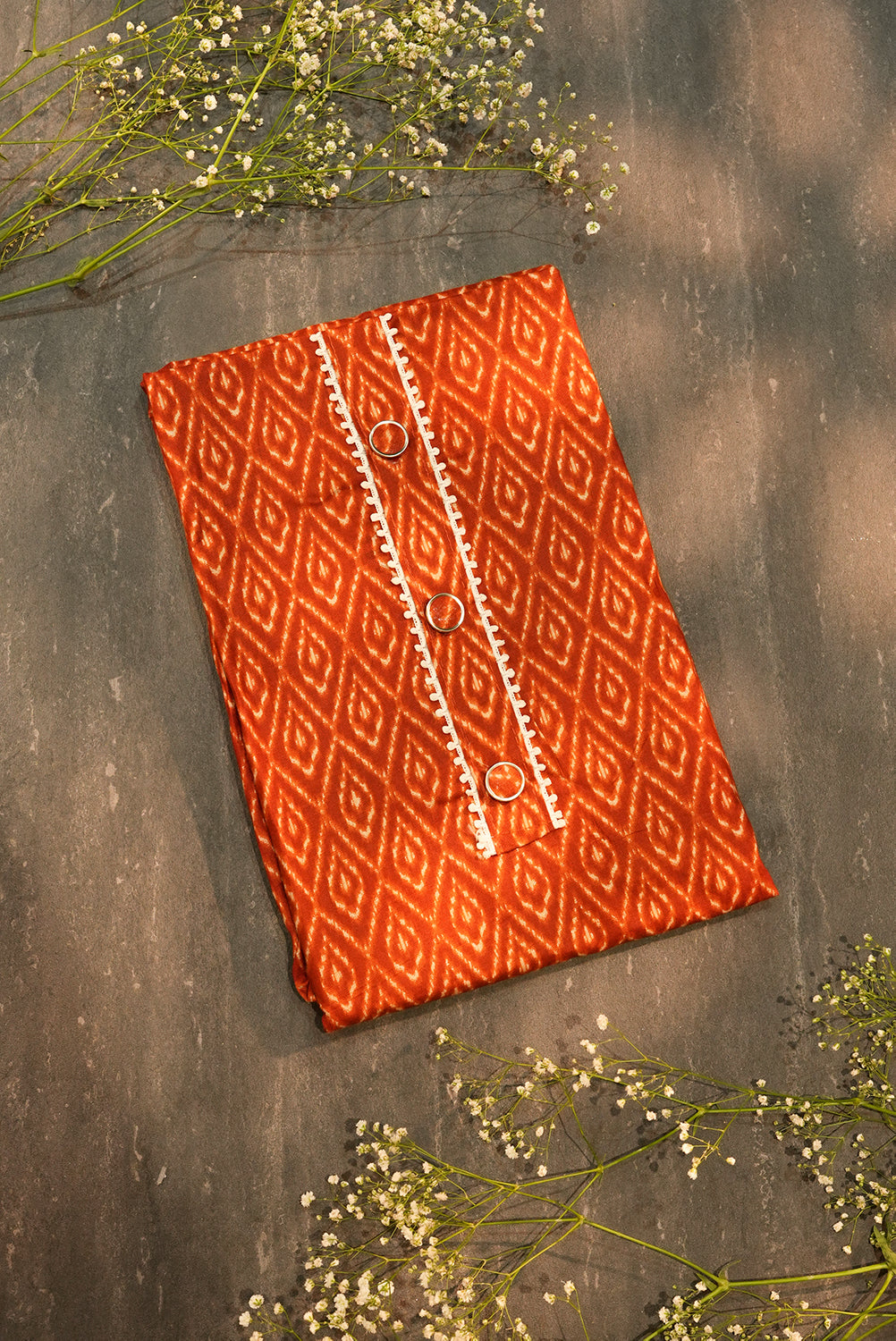 Rust Orange Geometric Ikat Salwar Set with Shibori Dupatta