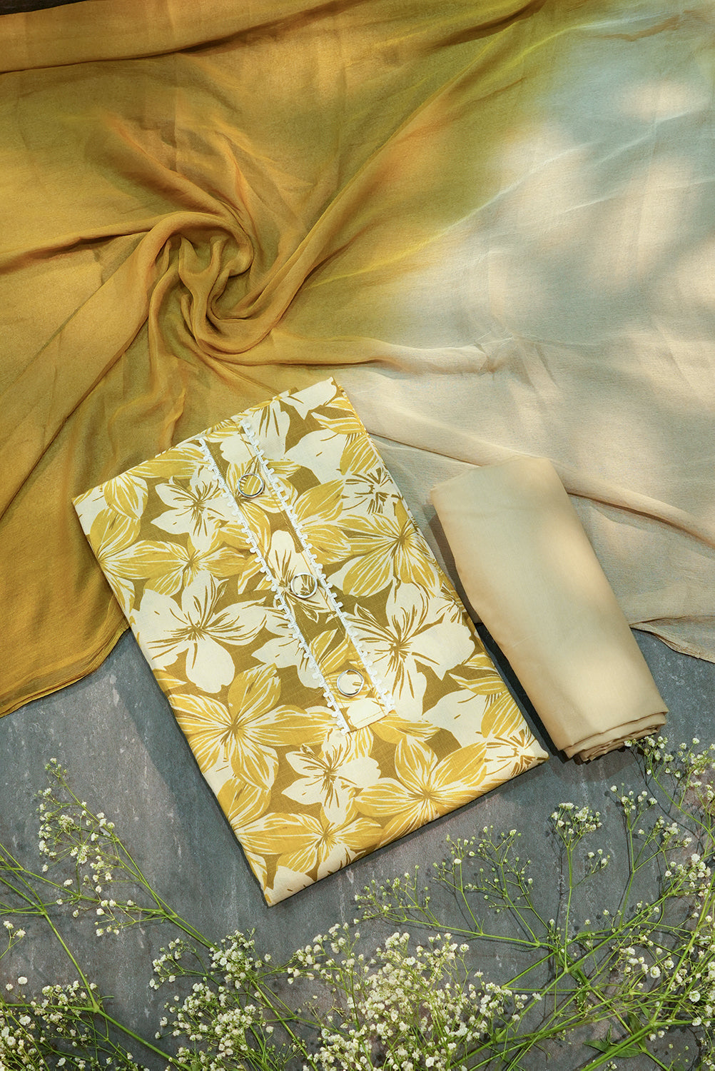 Olive Gold Floral Unstitched Salwar Set with Ombré Dupatta