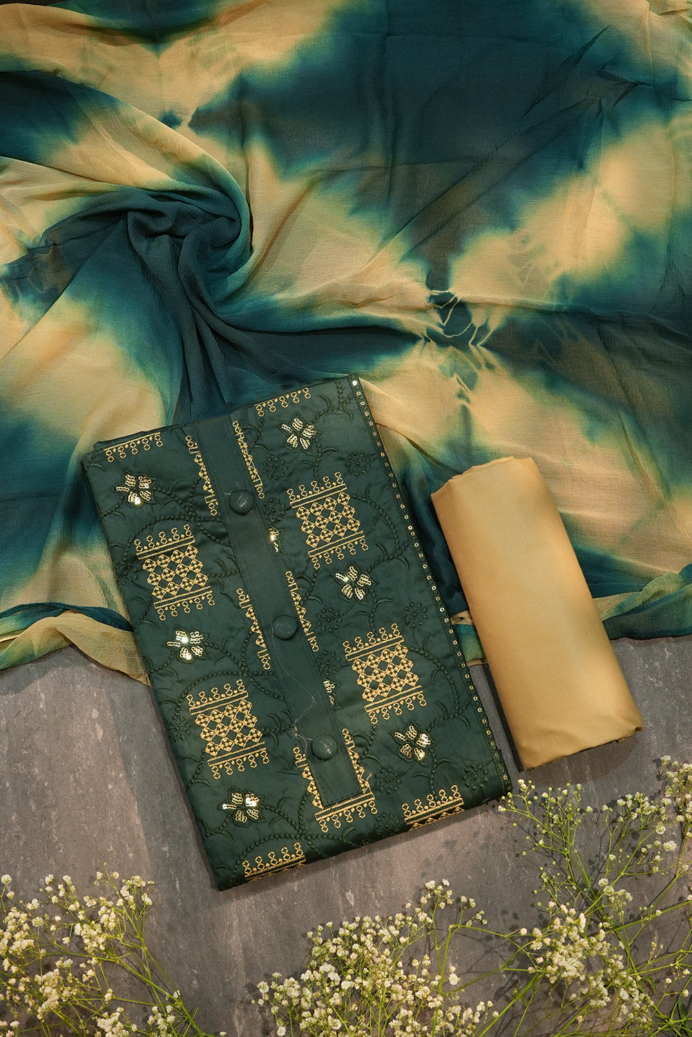 Forest Green Zari Work Suit Material with Shaded Shibori Dupatta