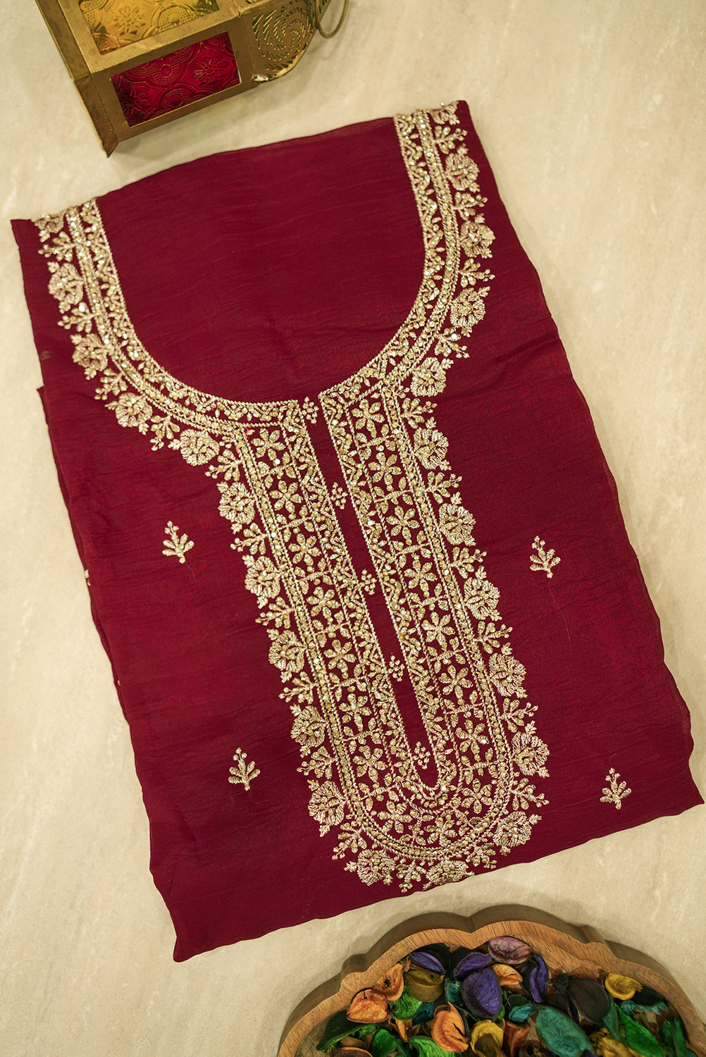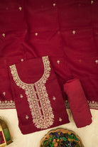 This unstitched three-piece salwar suit set exudes regal charm and sophistication. The rich, deep maroon kurta (top) features an exquisitely embroidered neckline in shimmering gold zari and delicate threadwork, along with subtle scattered motifs. The set includes a matching solid maroon salwar (pant) and a flowing dupatta (scarf) that complements the top with its own intricate embroidery along the border and scattered gold motifs. This luxurious ensemble is perfect for weddings, festive occasions, or any formal event where you want to make a grand statement.