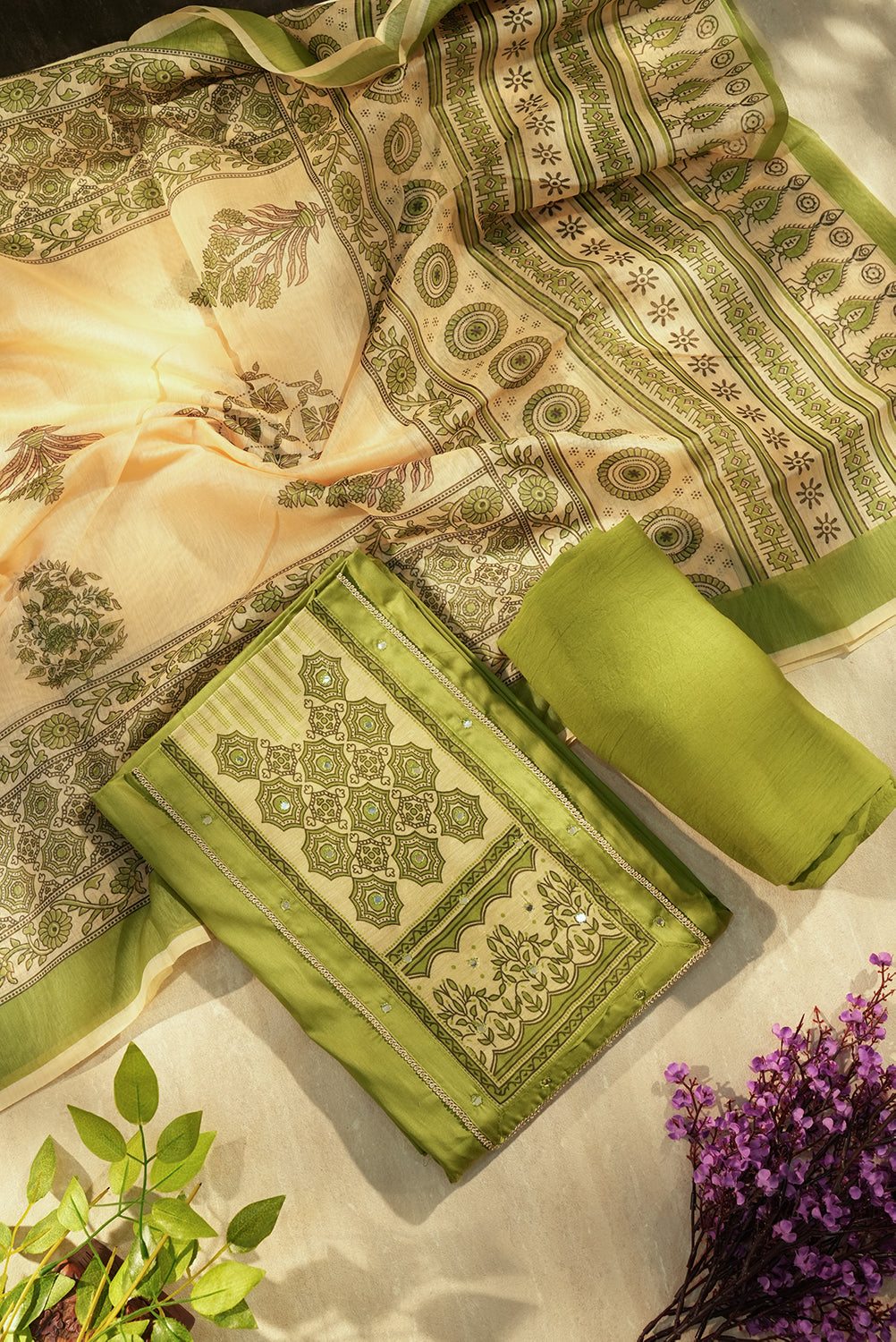 A perfect blend of nature-inspired tones. This set includes a solid leafy green bottom and a cream-toned dupatta featuring earthy olive-green floral motifs. The structured neck design on the top adds a touch of sophistication to your daily ensemble.