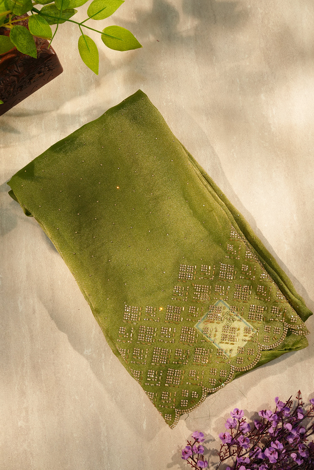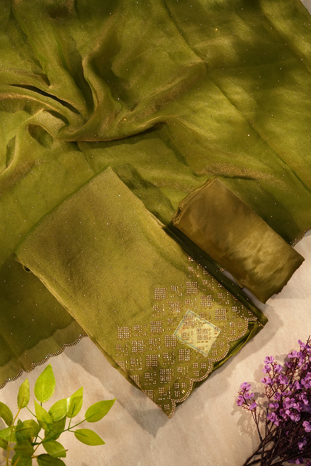 Celebrate in style with this elegant moss-olive ensemble. The lightweight, breathable fabric is highlighted by a delicate gold-toned stone work pattern on the border. Its unique scalloped finish and matching silk-finish bottom material make it a versatile choice for weddings or traditional gatherings.