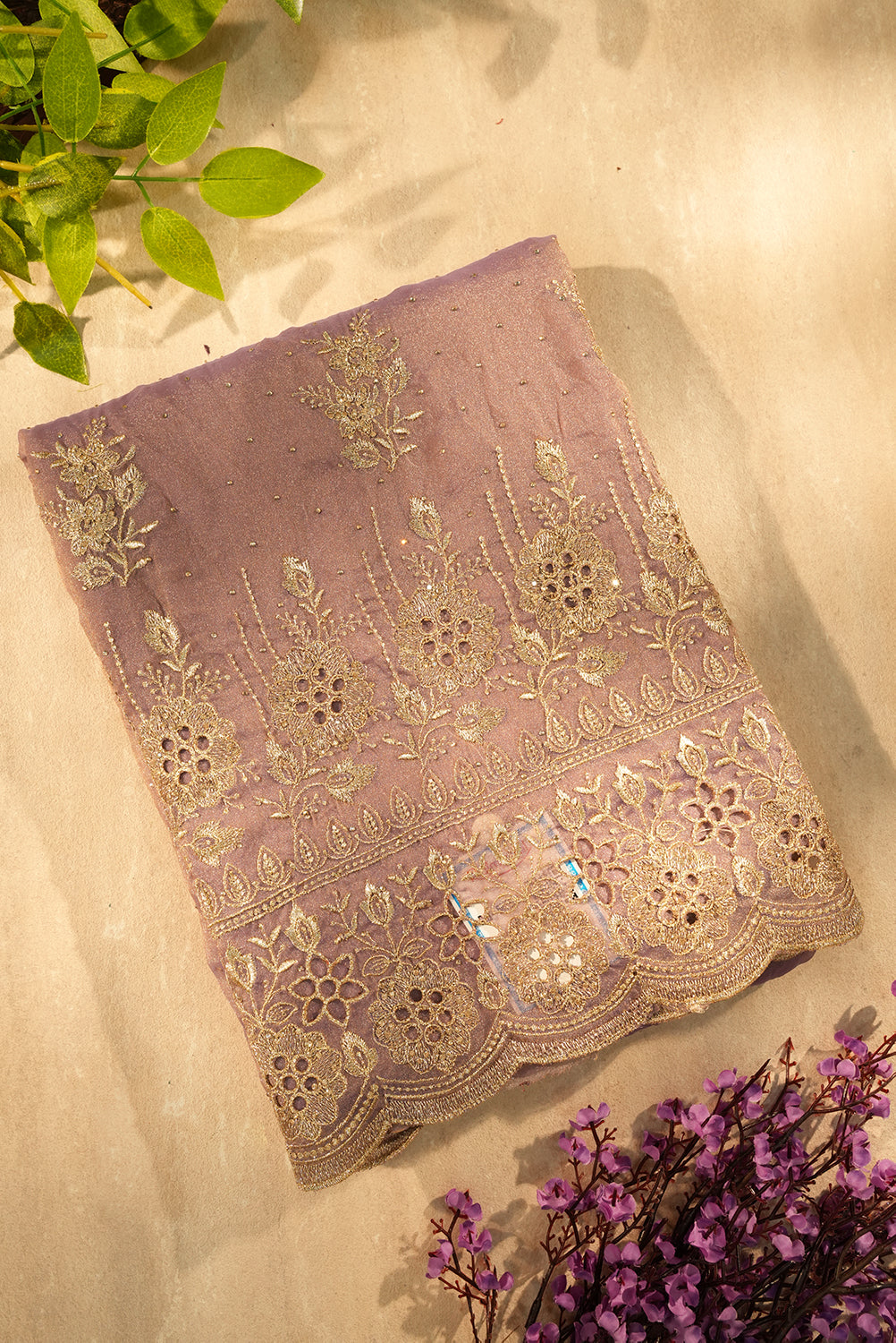 A sophisticated choice for festive wear, this set showcases a dusty mauve kameez enriched with intricate gold zari embroidery and mirror work. The ensemble is completed with a flowy, deep plum dupatta featuring delicate floral buttas and a scalloped embroidered edge.