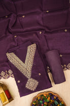 This unstitched three-piece salwar suit set exudes regal elegance and sophistication. The kurta (top) features an ornate, deeply embroidered neckline in shimmering gold zari, with a beautiful geometric motif. The set includes a matching solid purple salwar (pant) and a flowing, lightly textured dupatta (scarf) with scattered gold motifs and an elegant embroidered border. This luxurious ensemble is perfect for weddings, festive occasions, or any formal event where you want to make a grand statement.