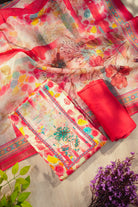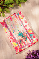 Brighten your day with this stunning unstitched suit featuring a cream-based top adorned with artistic floral digital prints and intricate turquoise beadwork. It is paired with a matching solid rose-red bottom and a breezy, lightweight dupatta showcasing a large-scale floral garden print. Perfect for casual outings and summer gatherings.