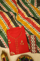 Make a statement with this eye-catching unstitched three-piece salwar suit. The rich, solid red cotton kurta (top) is beautifully adorned with intricate embroidery and delicate sequin work along the neckline and hem, adding a touch of sparkle. It comes with a matching printed salwar (pant) and a stunning, bold tribal-inspired printed dupatta (scarf) in a striking mix of red, yellow, green, and black. This ensemble is perfect for cultural events, festive occasions, or making a vibrant style statement.