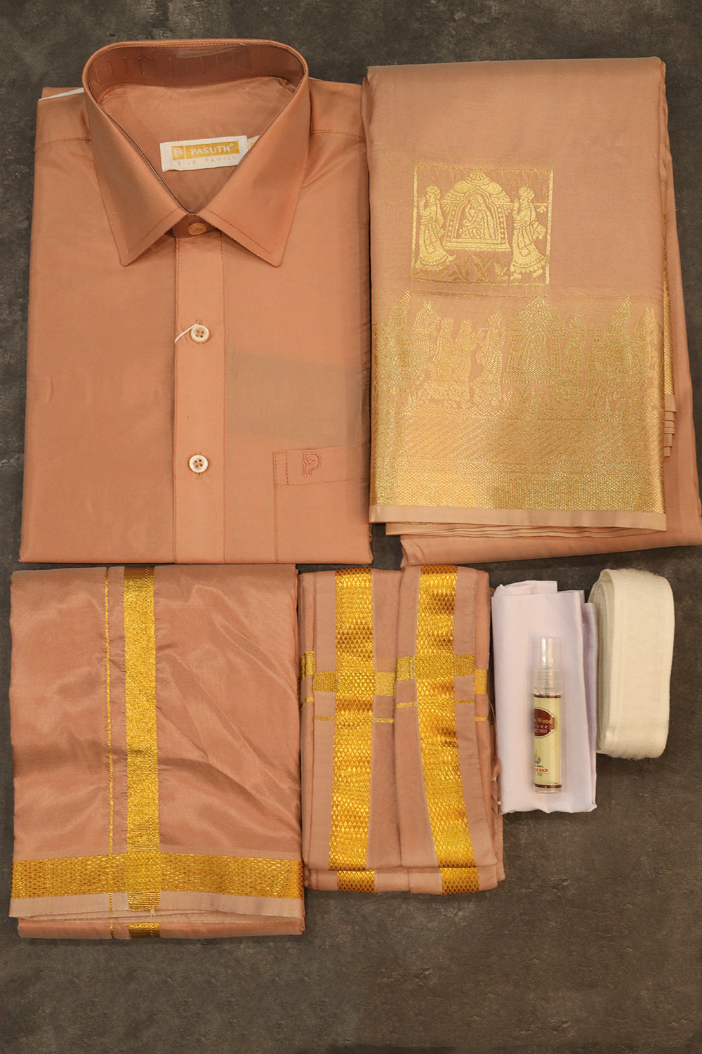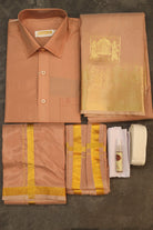 Copper Yuvan Yuvathi Silk Combo having Shirt, Dhoti, Saree, Angavastra, Velcro Belt and Hand Kerchief with Perfume