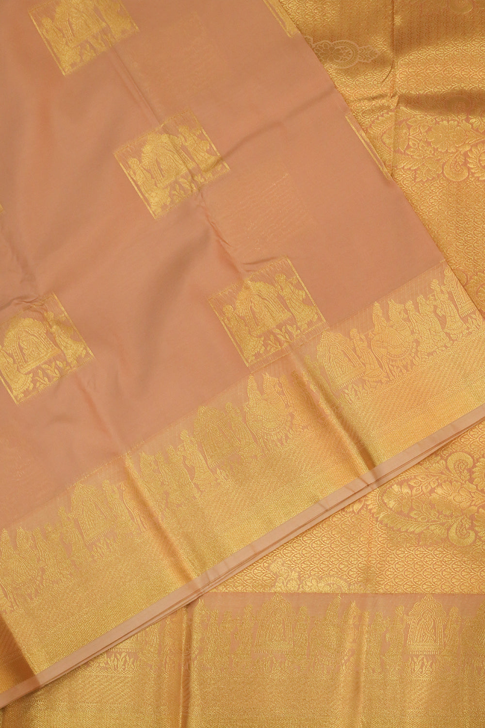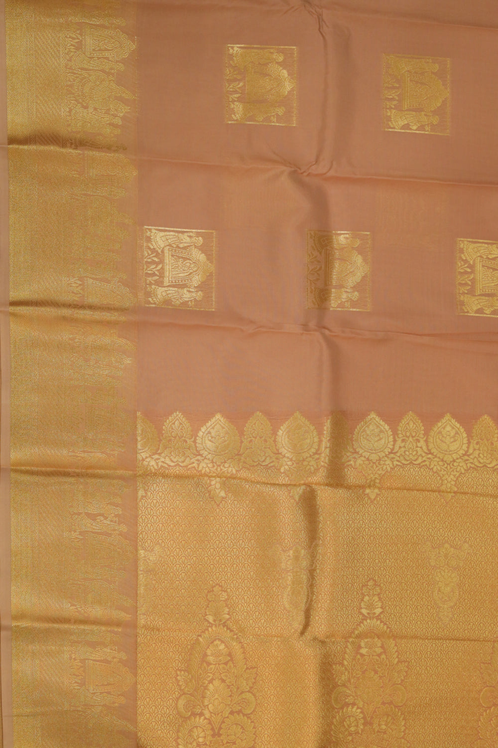 Silk Saree having a beautiful golden vivaah design all over the body. Gold Zari border. Unstitched blouse attached.