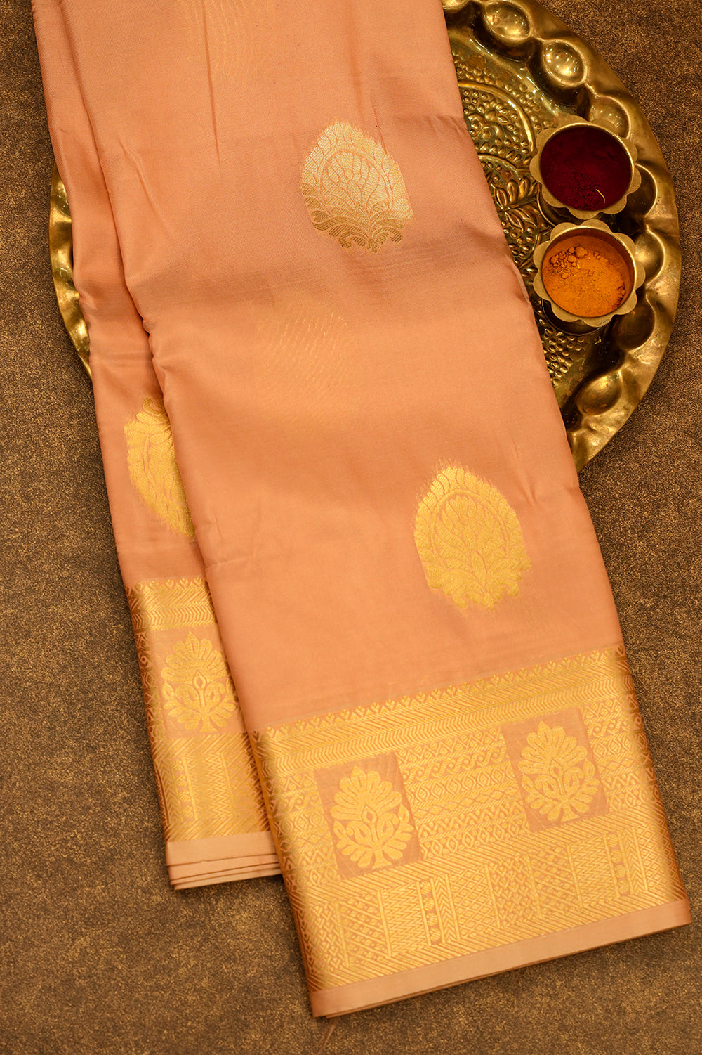 Silk Saree having a beautiful golden mango all over the body. Gold Zari border. Unstitched blouse attached.