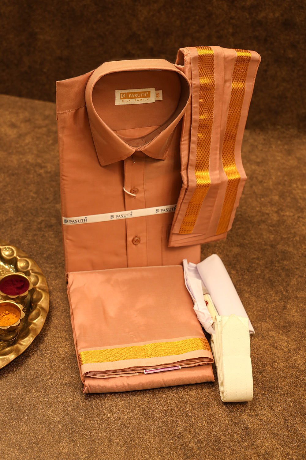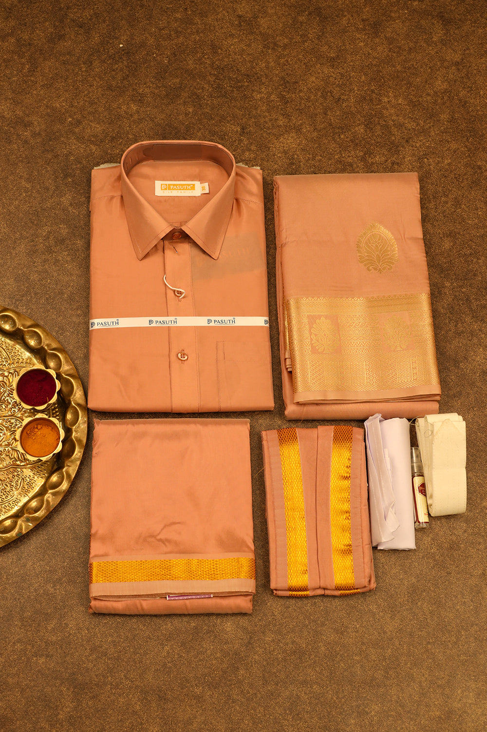Peach Yuvan Yuvathi Silk Combo having Shirt, Dhoti, Saree, Angavastra, Velcro Belt and Hand Kerchief with Perfume