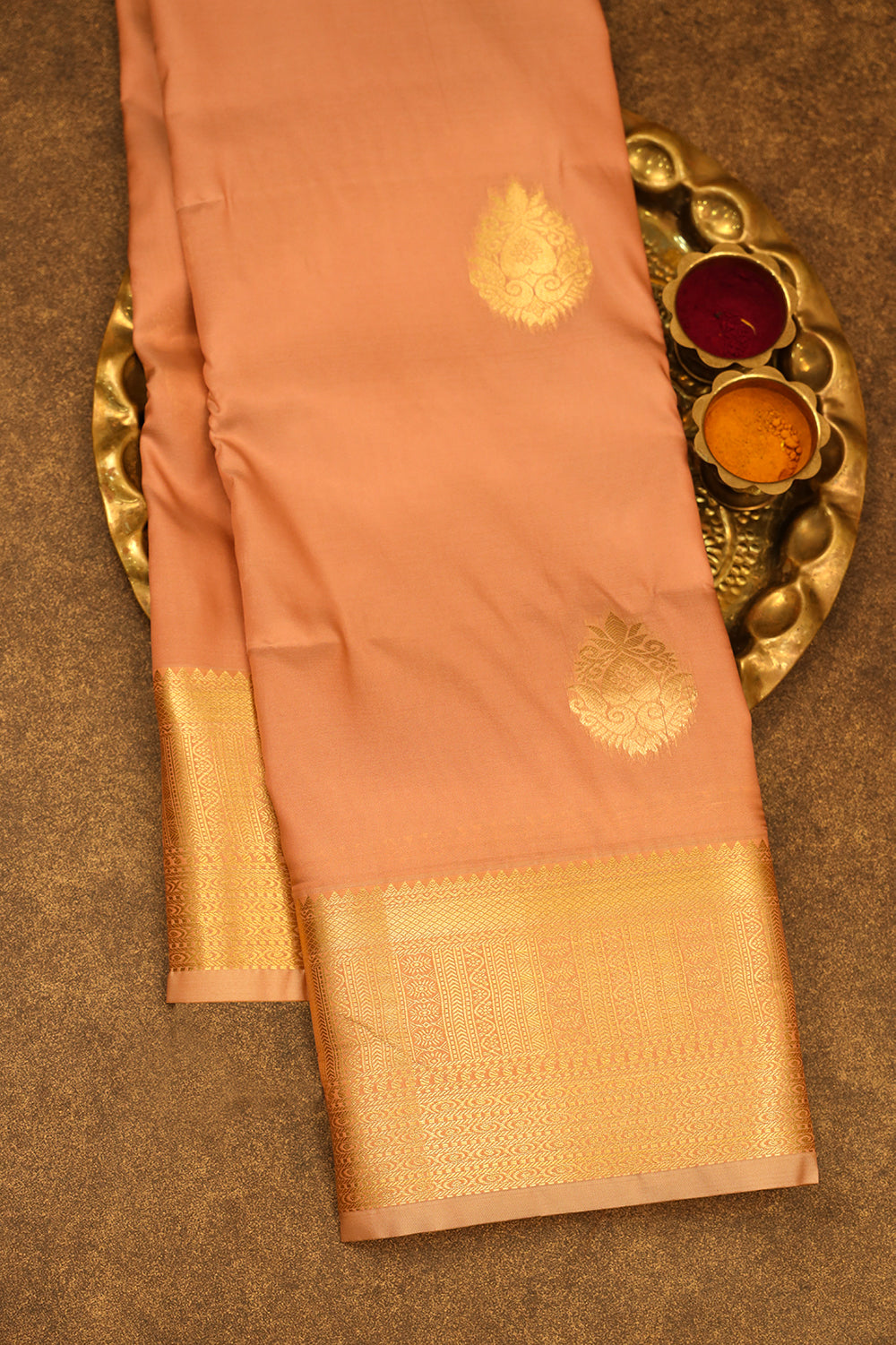 Silk Saree having a beautiful golden mango all over the body. Gold Zari border. Unstitched blouse attached.