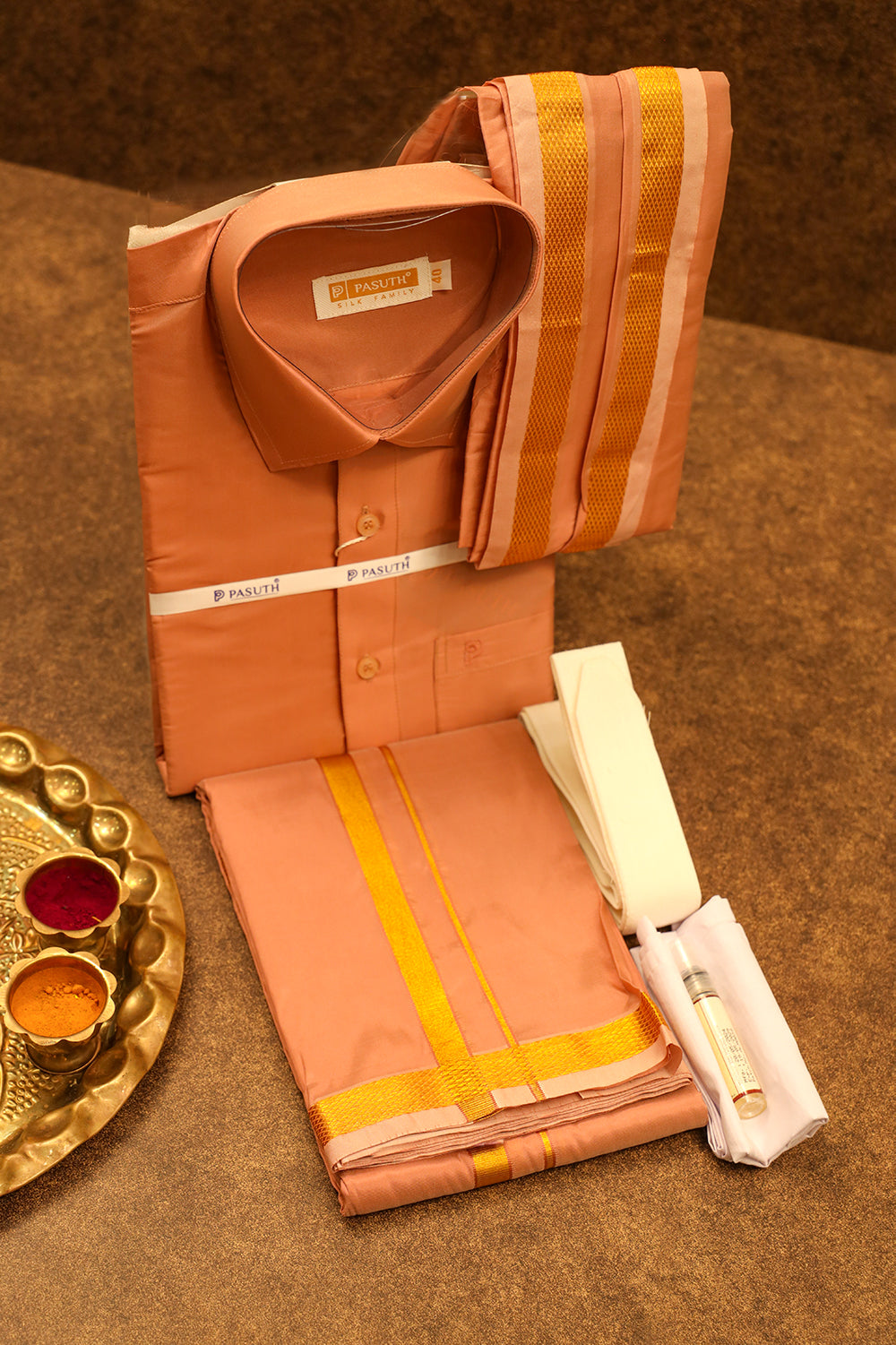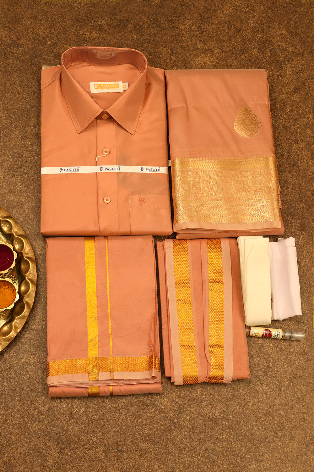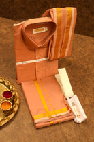 Peach Yuvan Yuvathi Silk Combo having Shirt, Dhoti, Saree, Angavastra, Velcro Belt and Hand Kerchief with Perfume