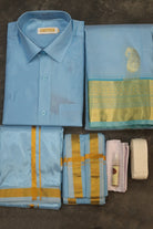 Sky Blue Yuvan Yuvathi Silk Combo having Shirt, Dhoti, Saree, Angavastra, Velcro Belt and Hand Kerchief with Perfume