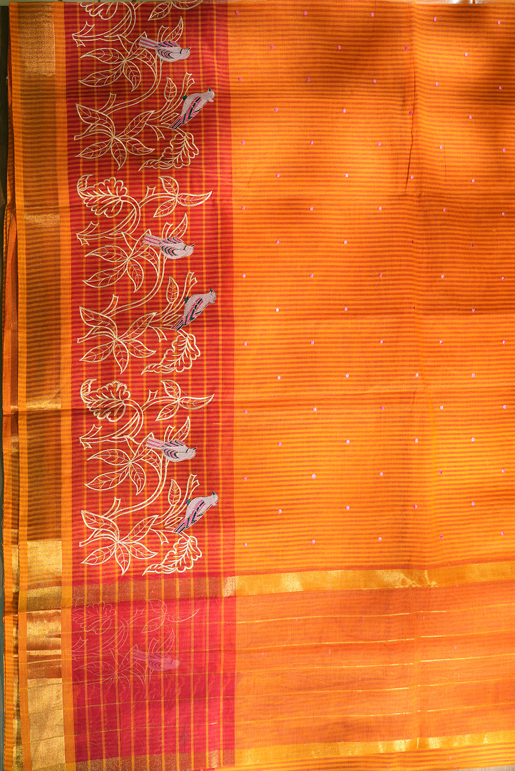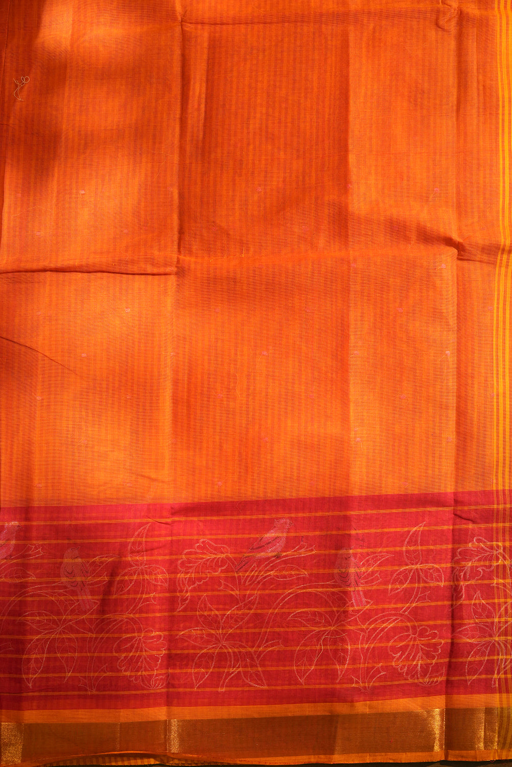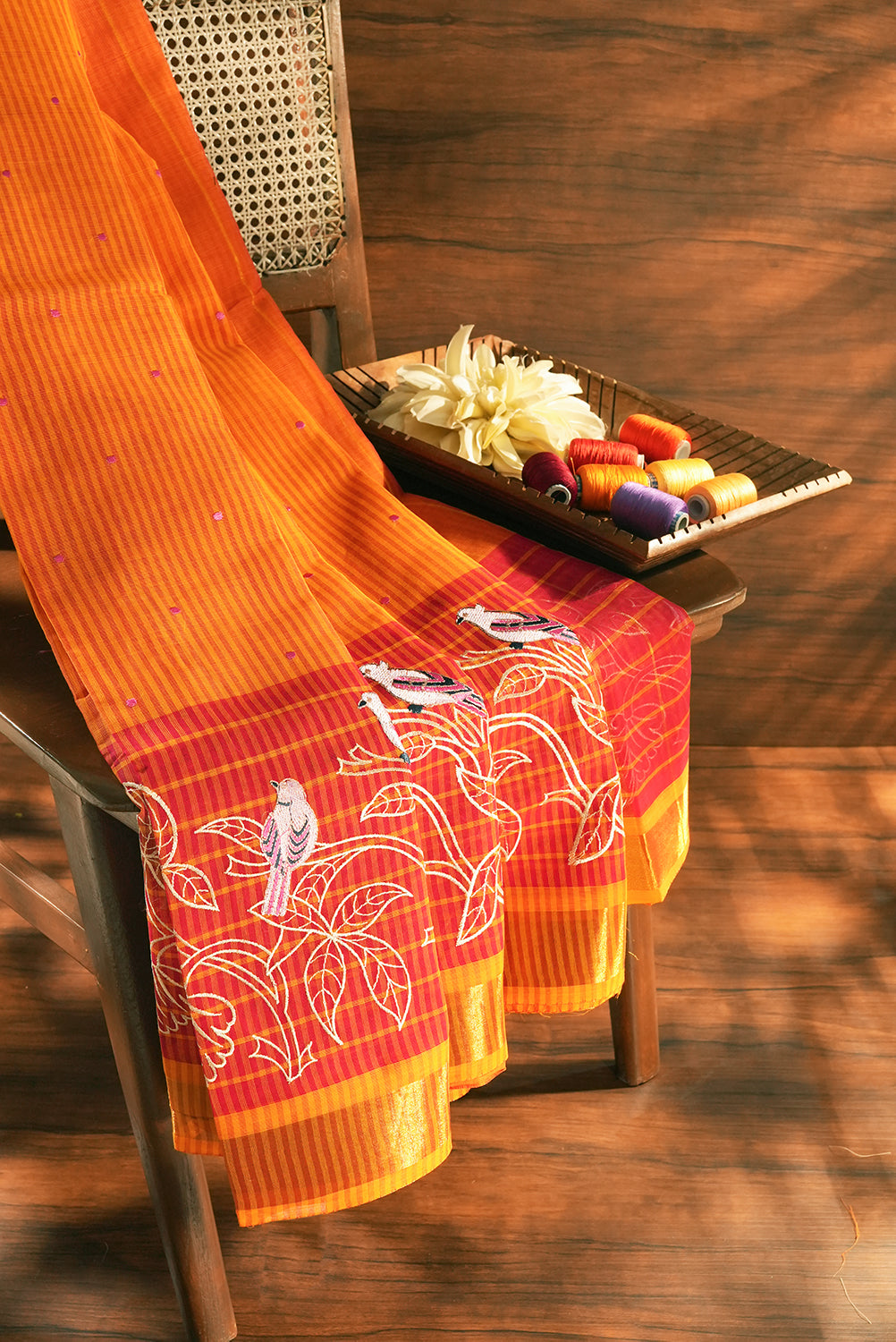 Sunset Orange Cotton Saree with Hand-Embroidered Bird Motifs