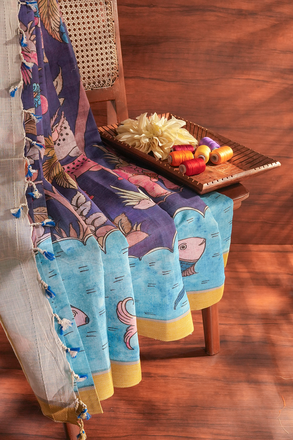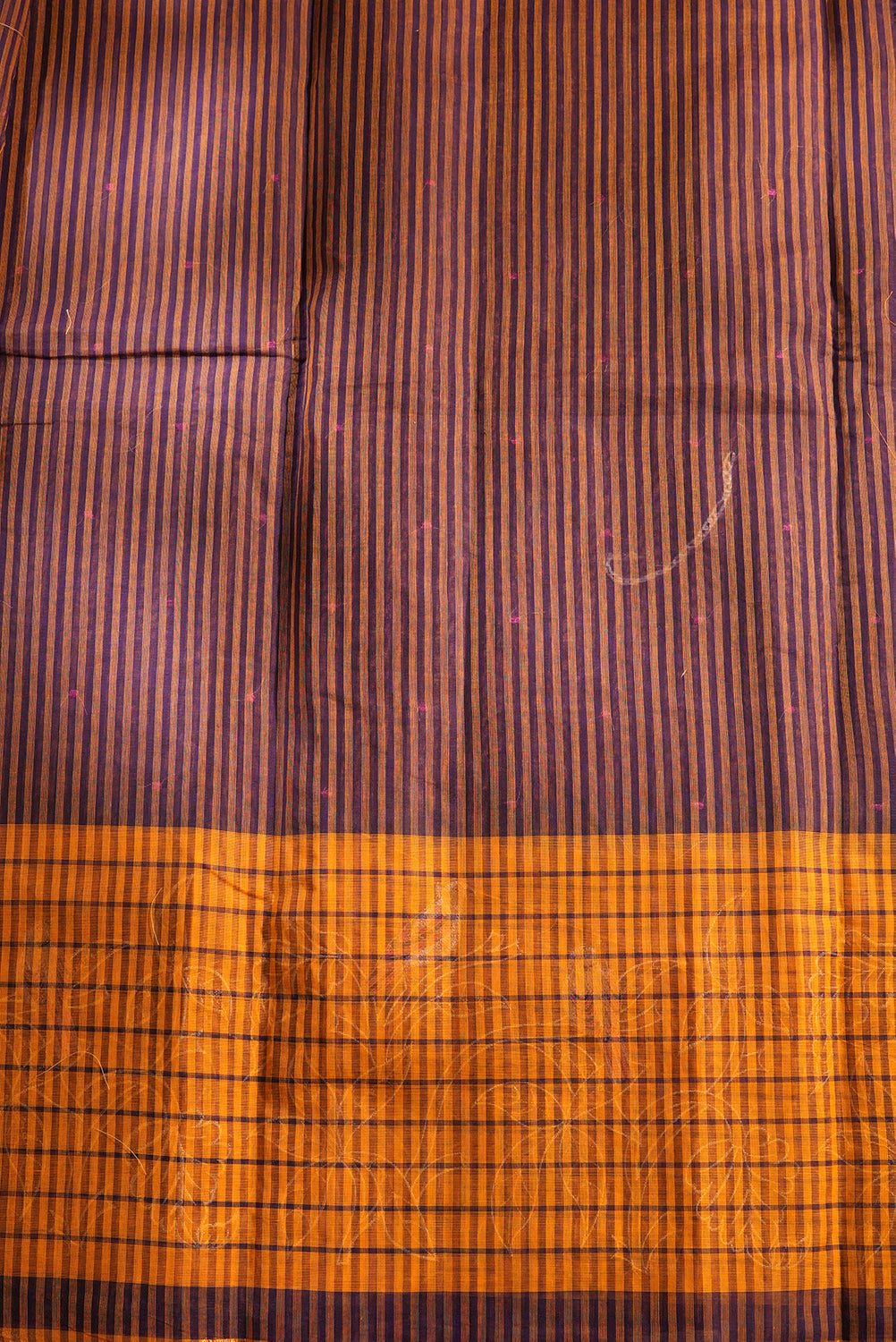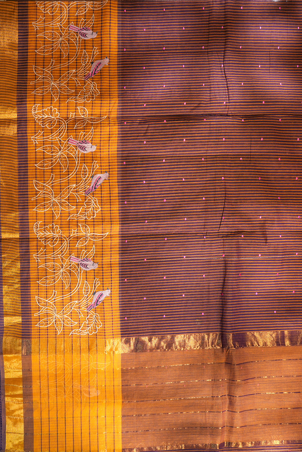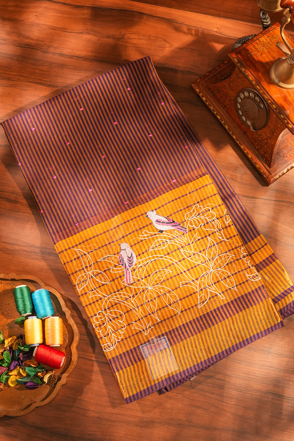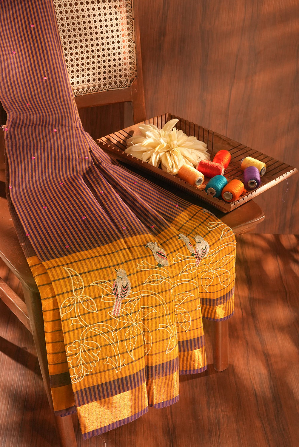 Mustard & Midnight Purple Handloom Cotton Saree with Bird Embroidery