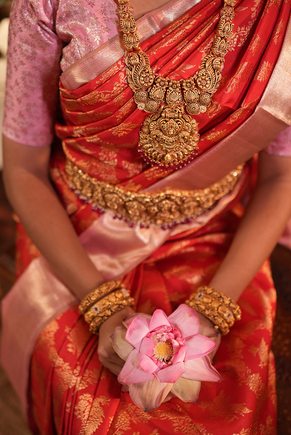 Royal Red Bridal Silk Saree with Antique Gold Zari Motifs & Soft Pink Border