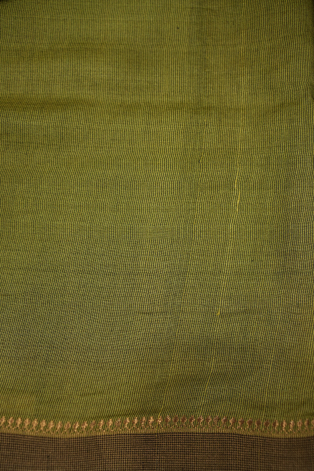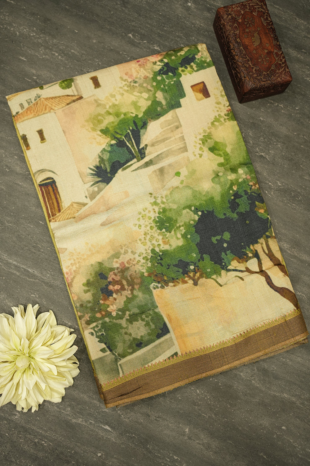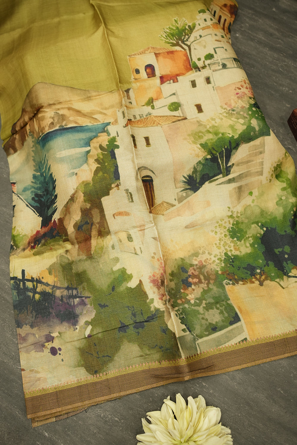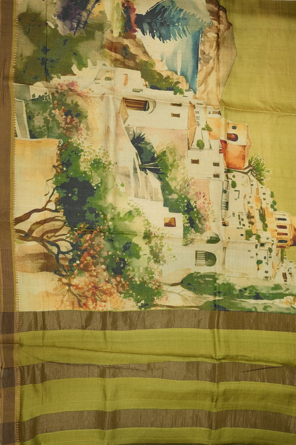 A beautiful tussar silk saree showcasing a picturesque European town painting. The primary color is a subtle olive green, with the intricate artwork in white, blue, and various green hues. It is finished with elegant olive and brown striped borders. Unstitched blouse attached.