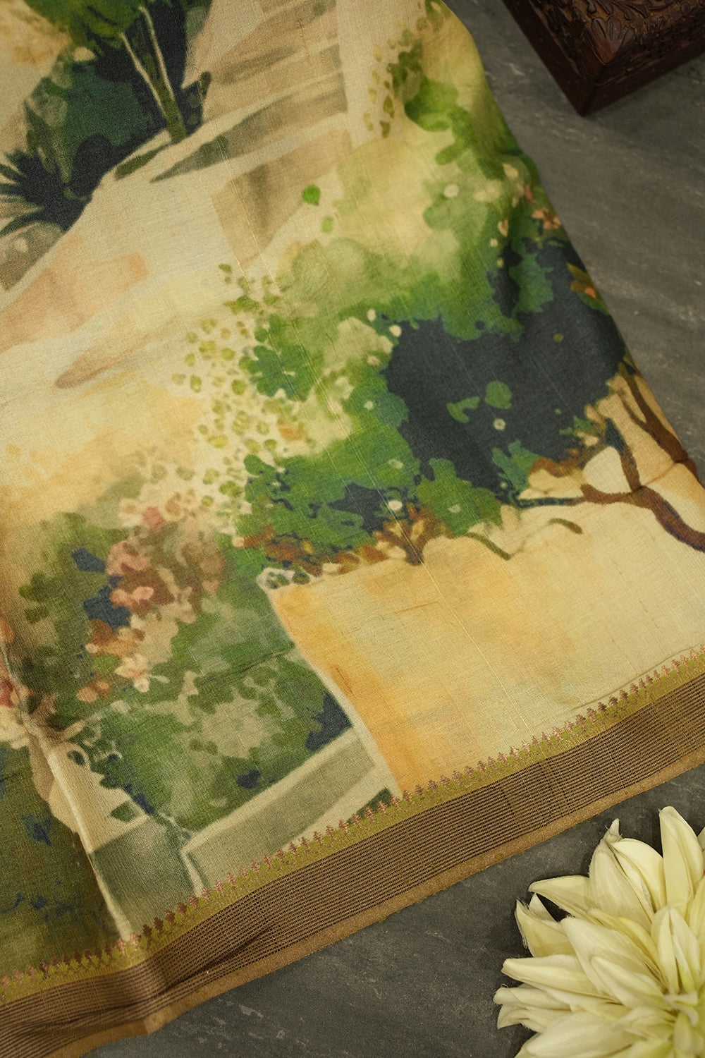 Artistic Landscape Print Olive Green Tussar Saree