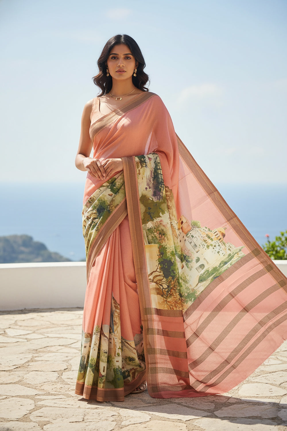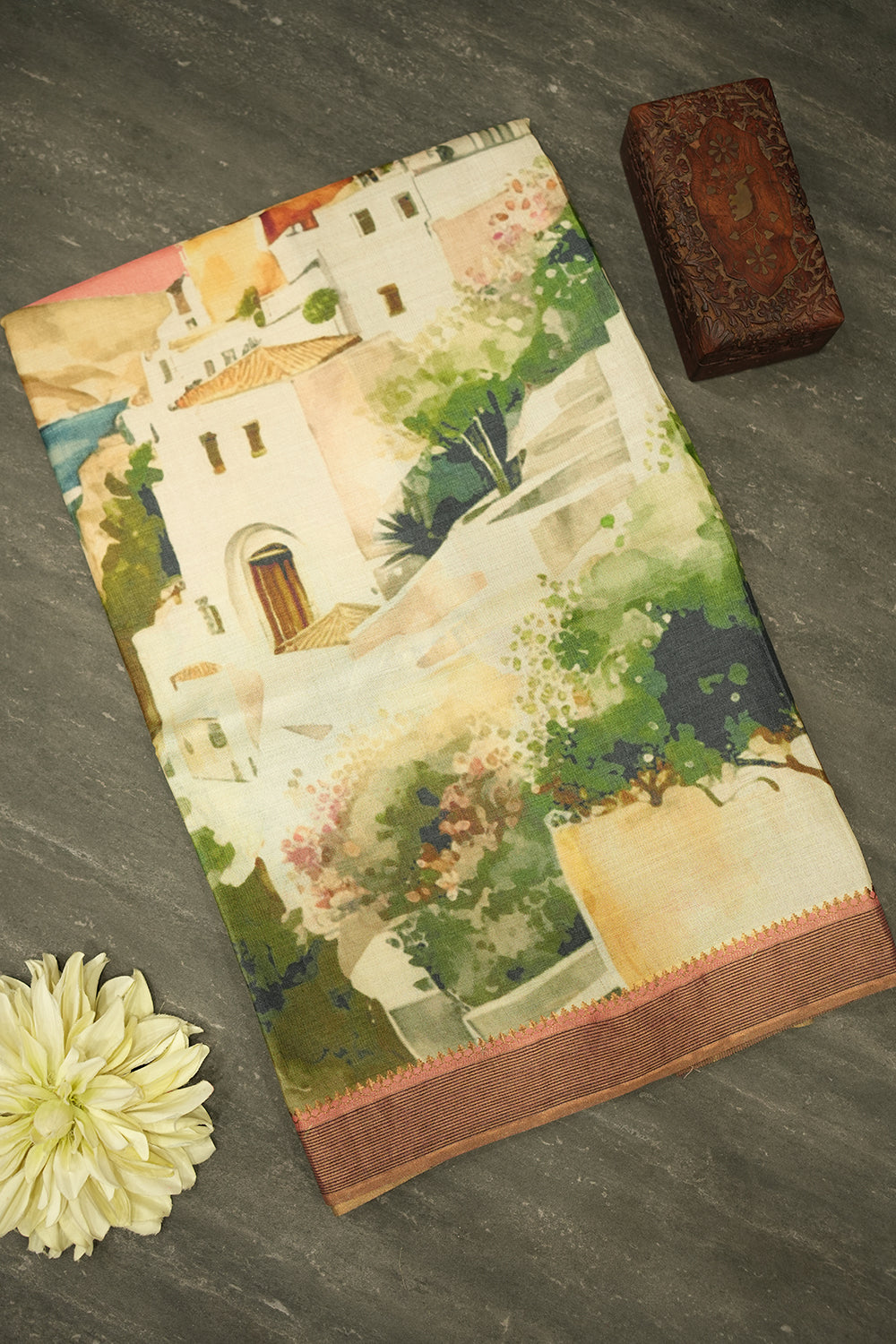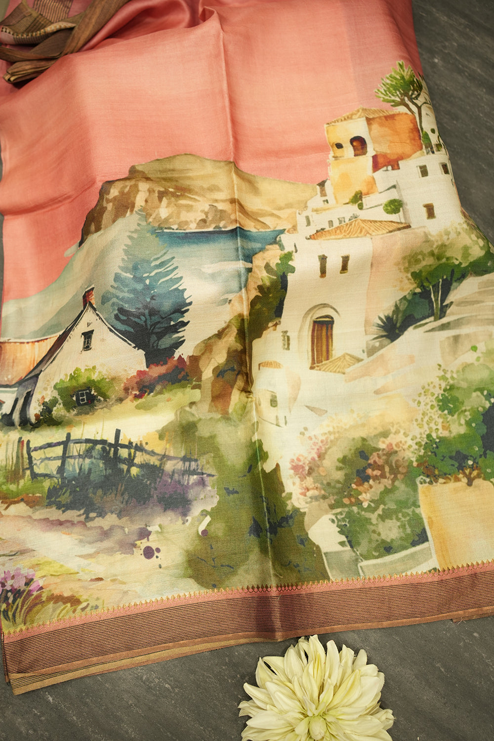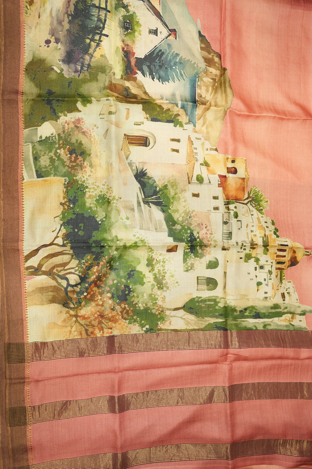 This exquisite Tussar silk saree features a beautiful scenic print dominated by hues of green, white, and earthy tones, depicting charming architecture and lush landscapes. A delicate pink border adds a subtle contrast to this elegant drape. Unstitched blouse attached.