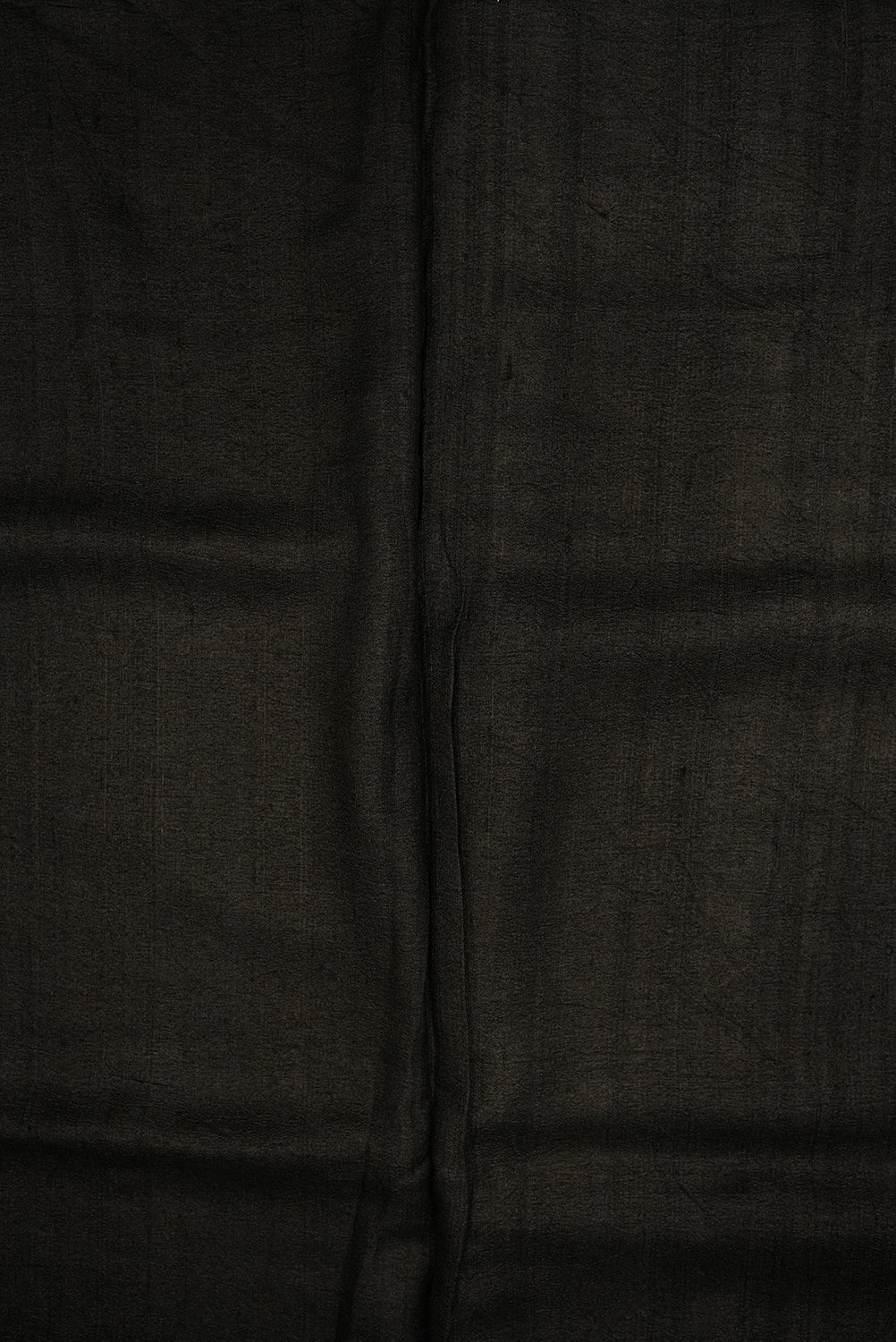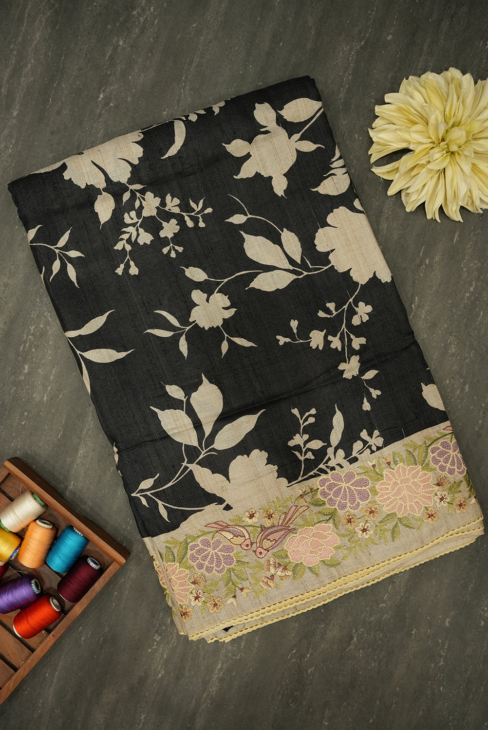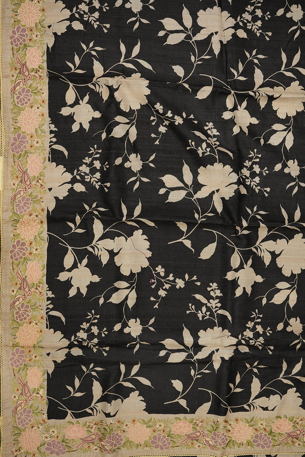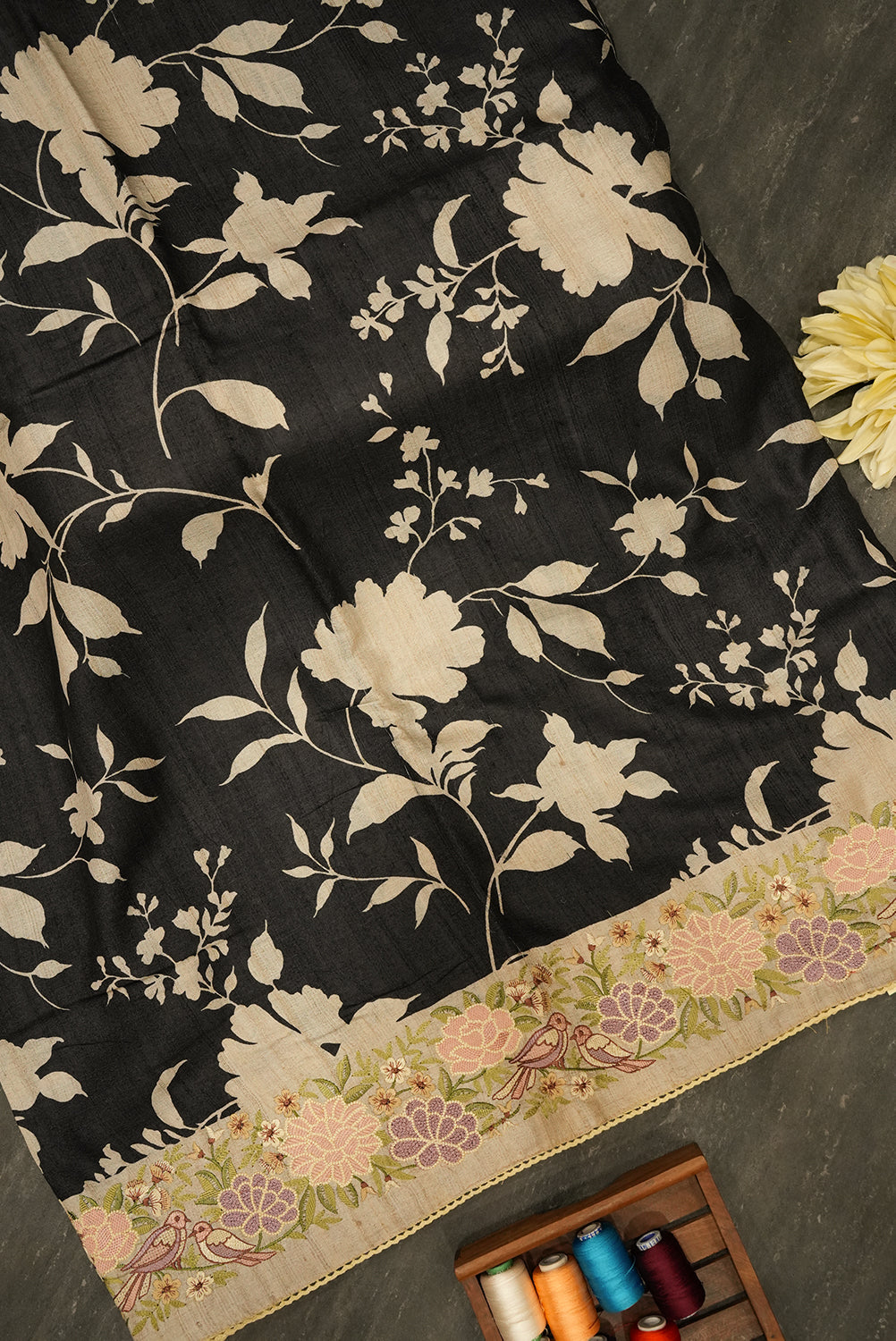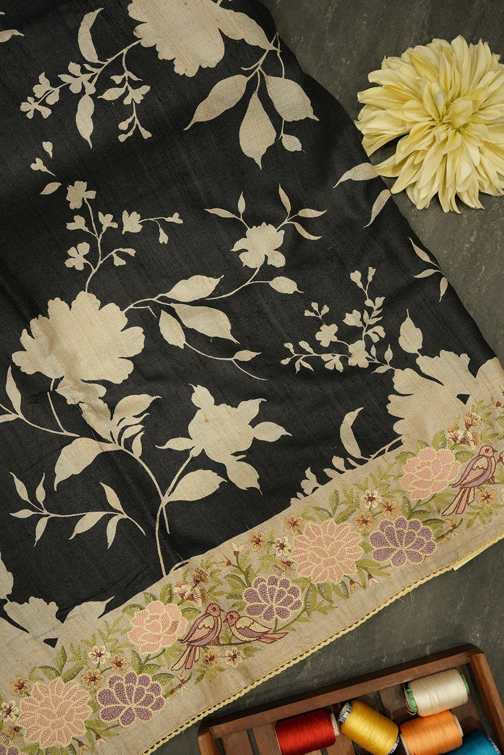 An elegant Tussar silk saree featuring a black body with a striking cream floral print. The saree is elevated by a contrasting, embroidered border showcasing delicate pink and lavender flowers with charming bird motifs. Unstitched blouse attached.