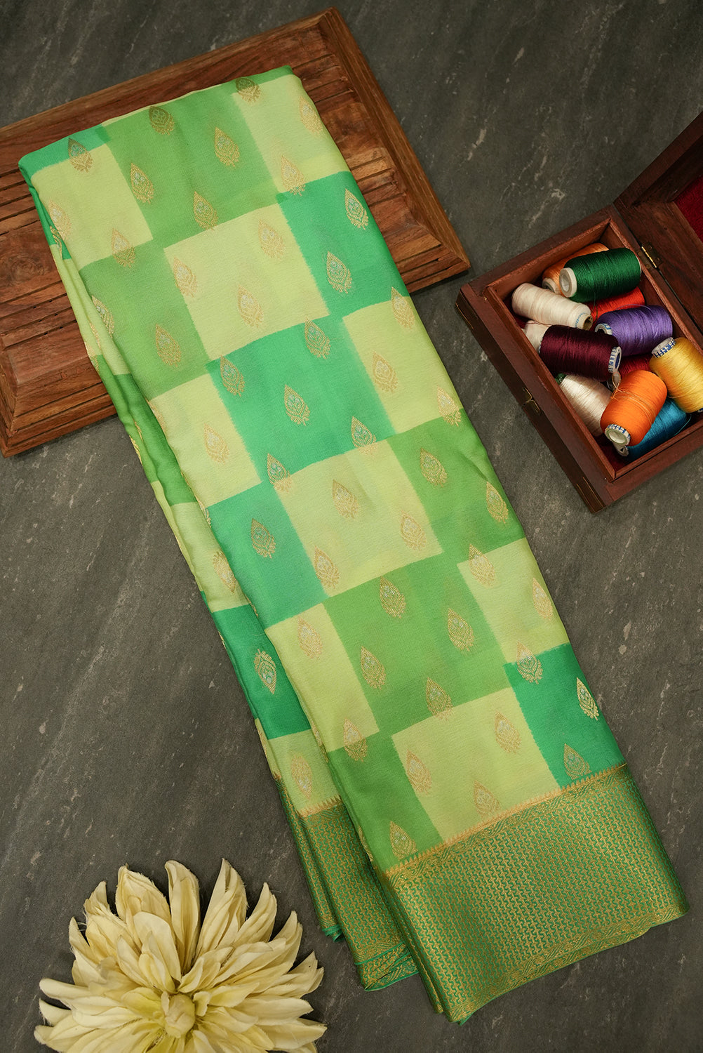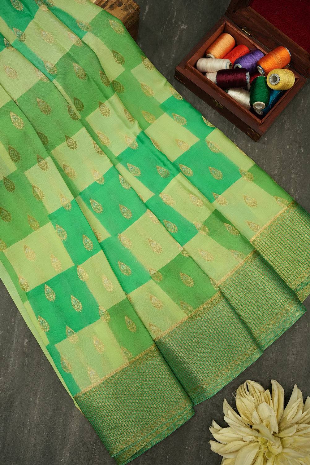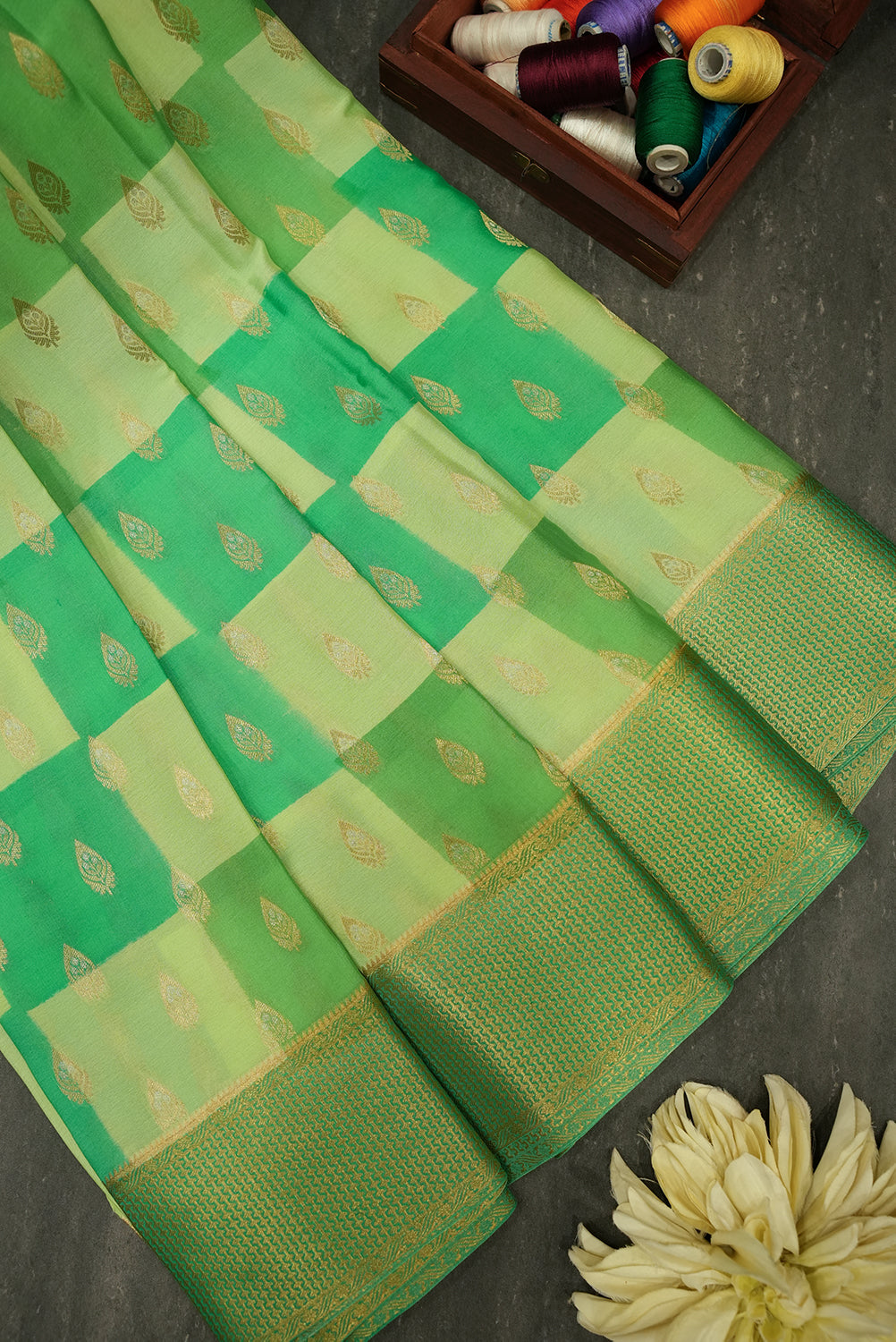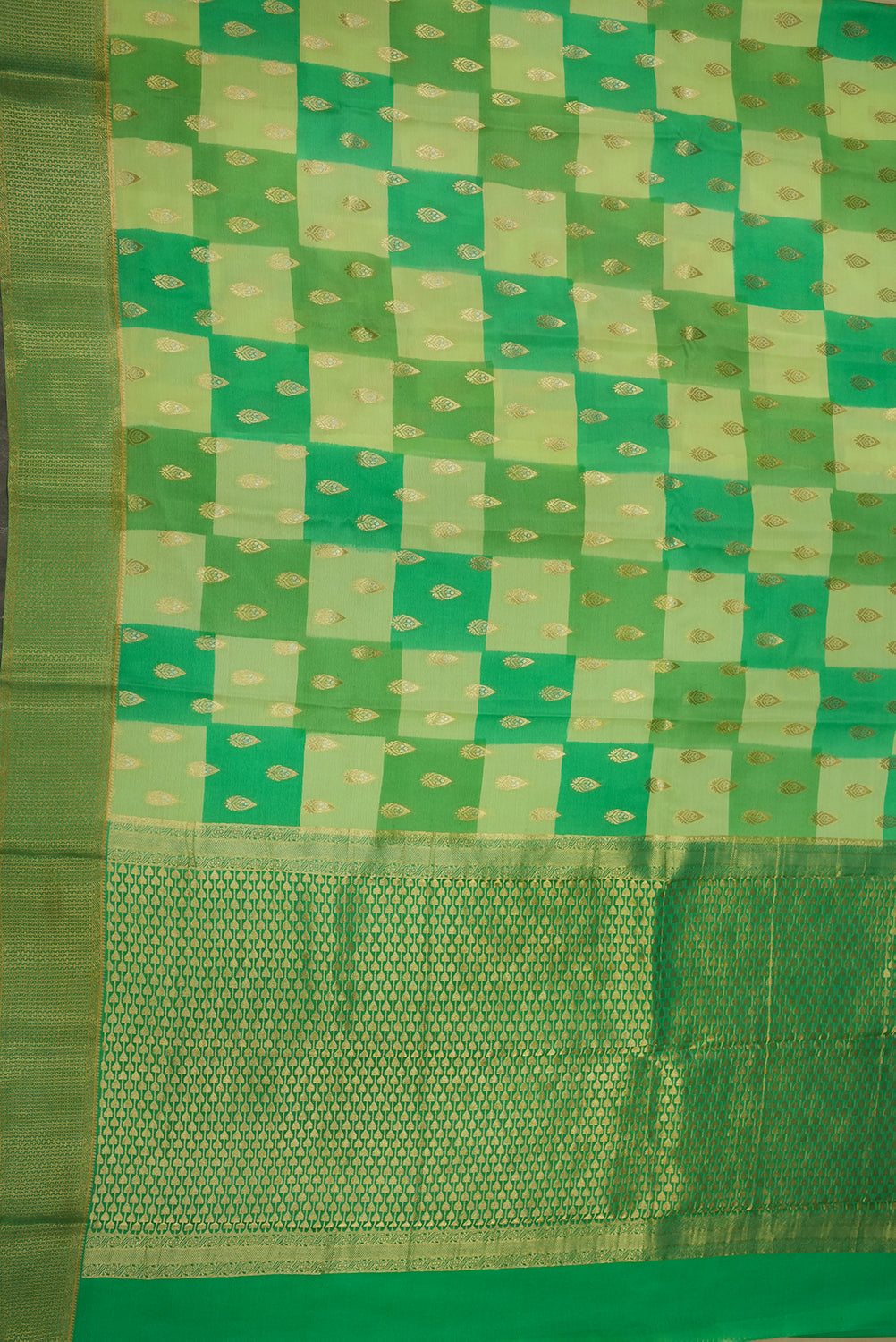 Experience the timeless elegance of this pure Mysore silk saree. The body of the saree has a unique checkered pattern in light and dark green, enhanced with delicate gold leaf motifs. The elaborate border and pallu are woven with traditional gold zari designs. Unstitched blouse attached.