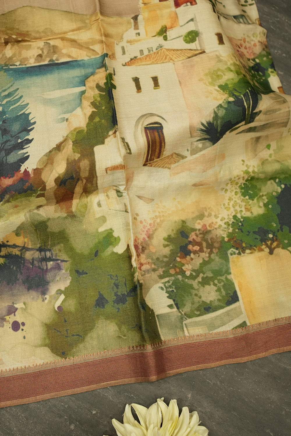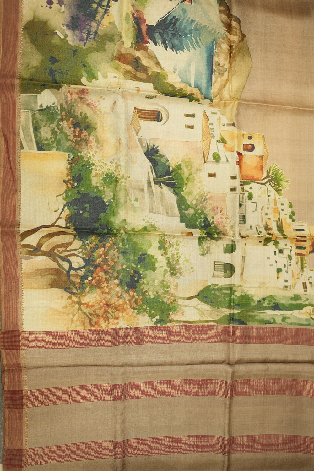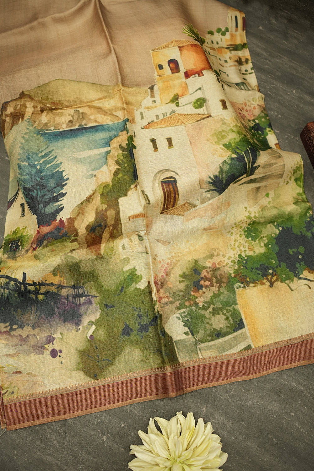 A stunning Choco brown Tussar silk saree showcasing an enchanting hand-painted landscape of a whitewashed village nestled amidst verdant foliage. The saree's body is a choco brown, contrasted by a sophisticated striped border in muted reddish-brown and beige tones. Unstitched blouse attached.