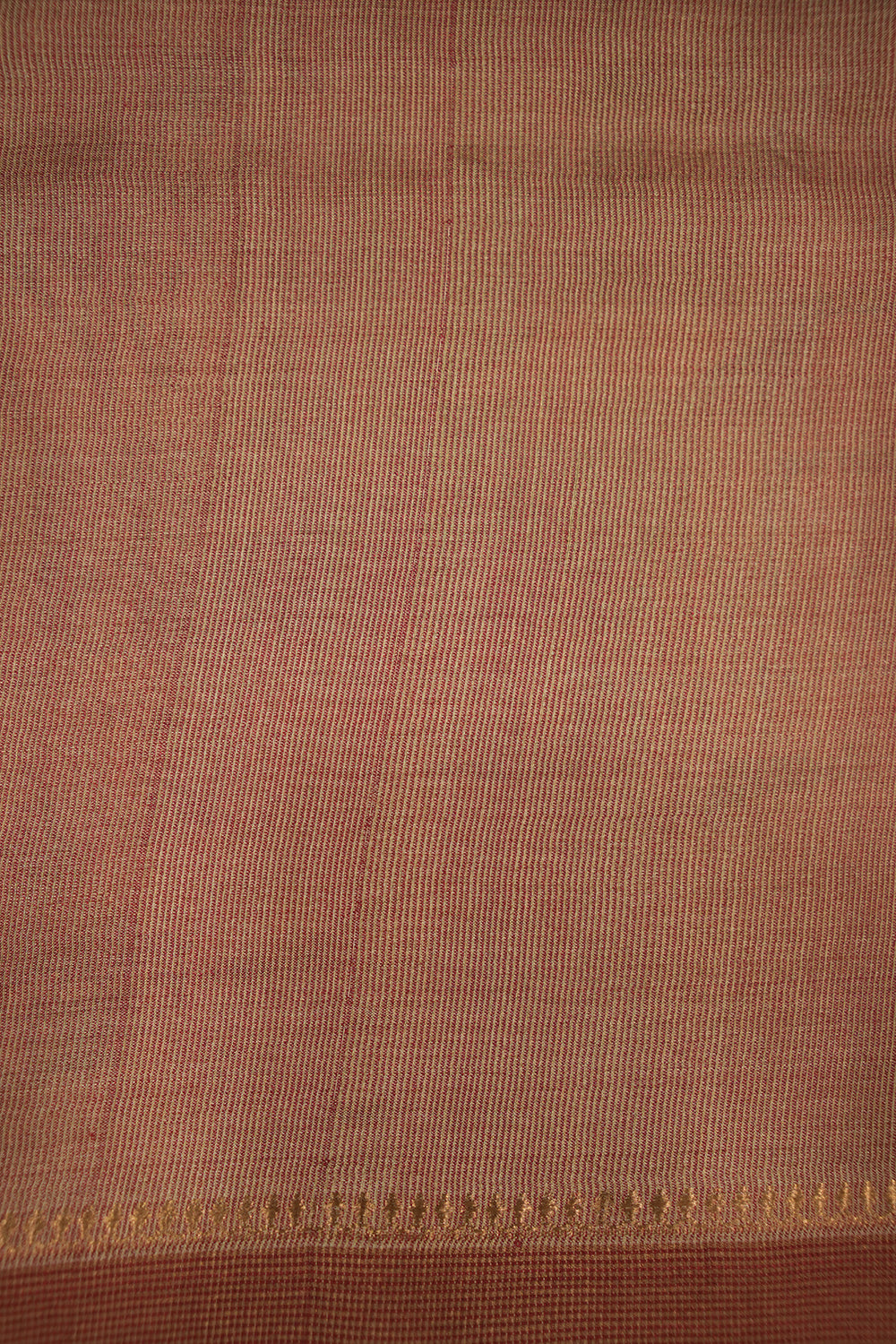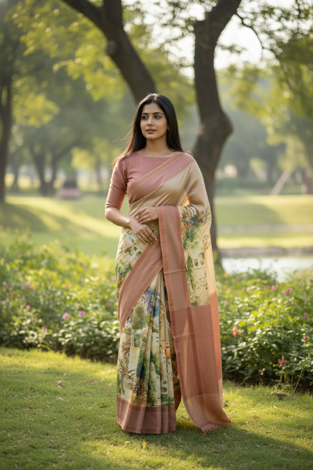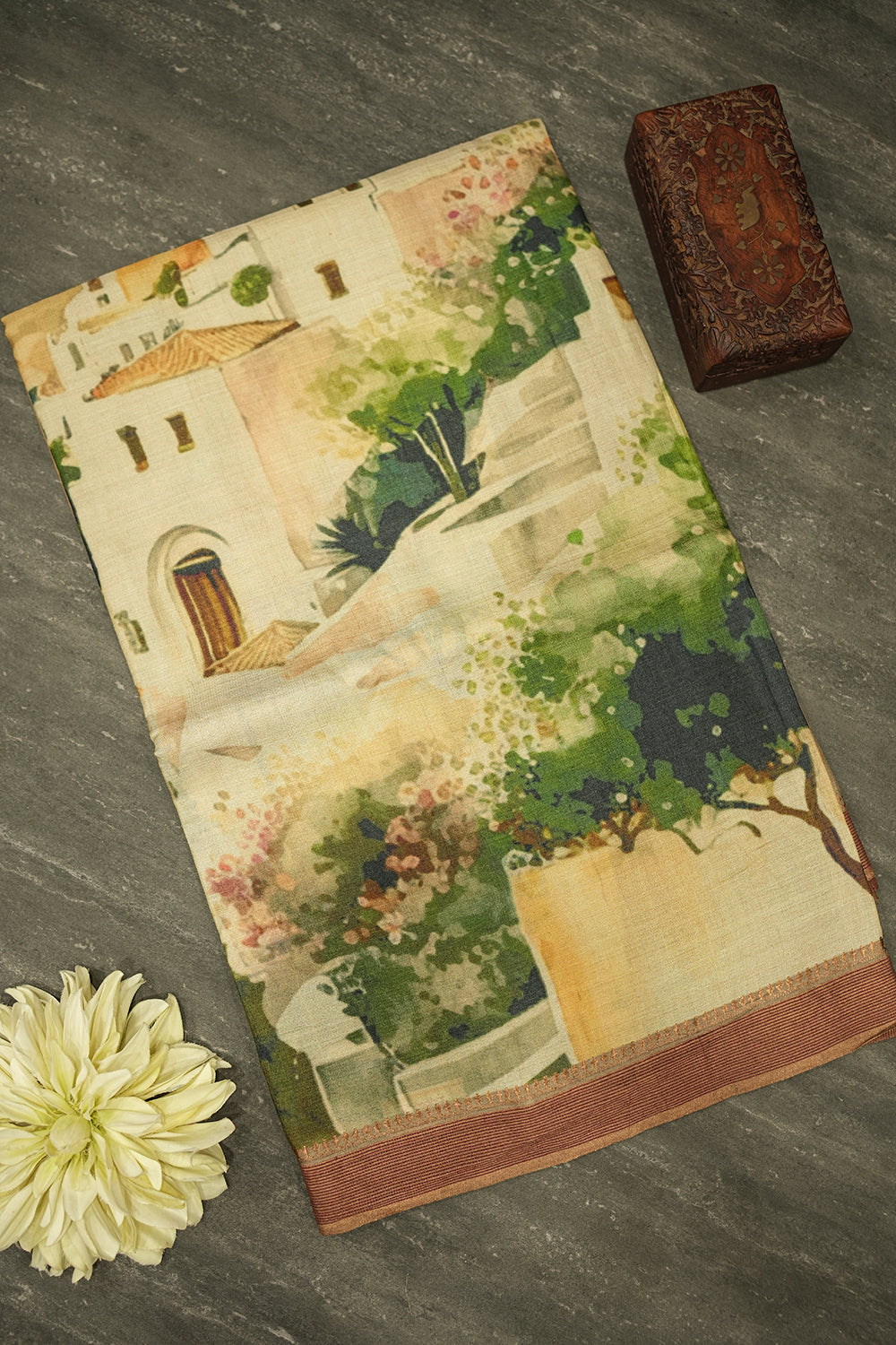 A stunning Choco brown Tussar silk saree showcasing an enchanting hand-painted landscape of a whitewashed village nestled amidst verdant foliage. The saree's body is a choco brown, contrasted by a sophisticated striped border in muted reddish-brown and beige tones. Unstitched blouse attached.