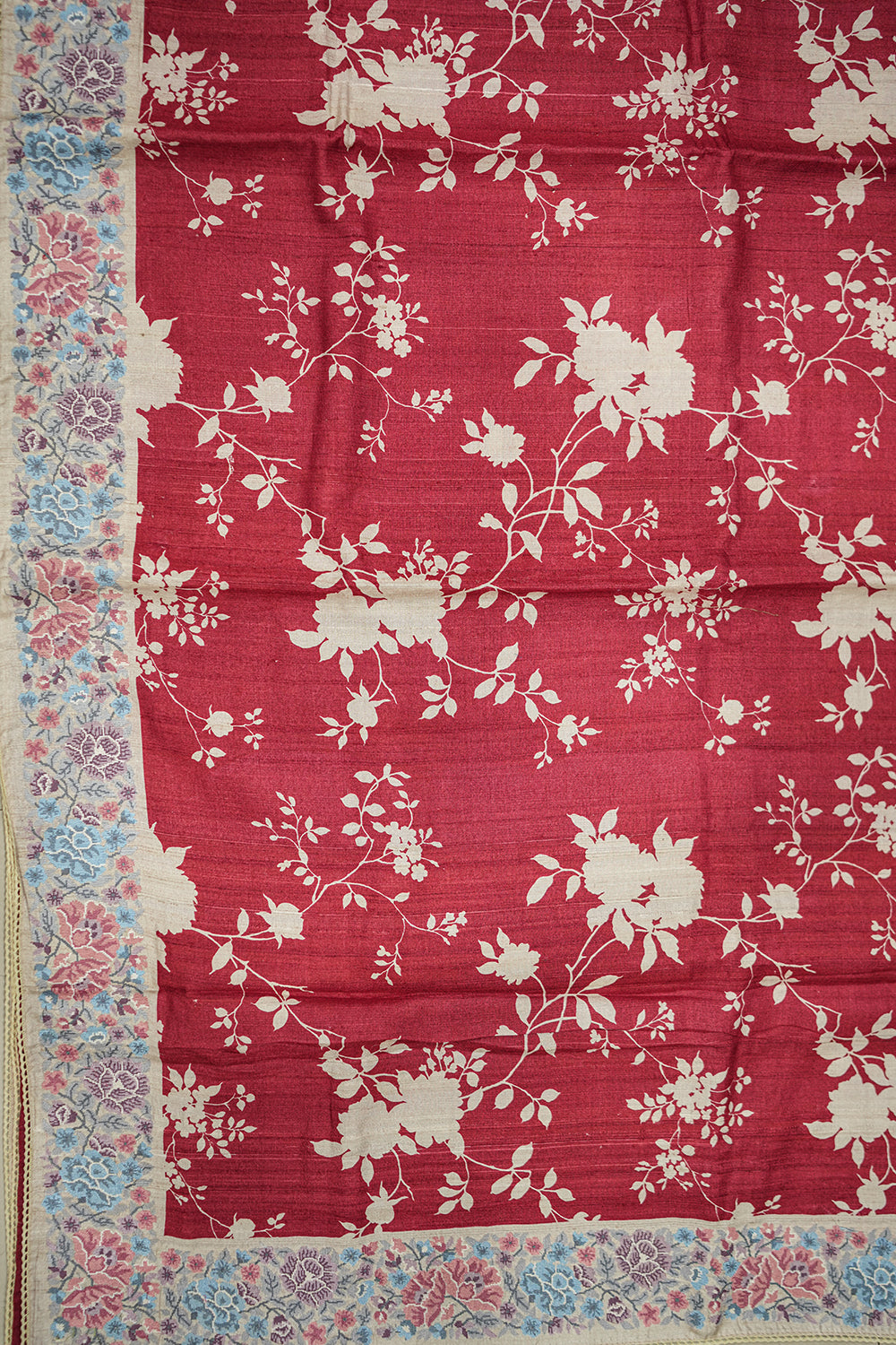 This beautiful Tussar silk saree features a rich maroon body adorned with delicate white floral motifs. The contrasting border showcases an exquisite interplay of pastel shades including blue, pink, and hints of lavender and beige. Unstitched blouse attached.
