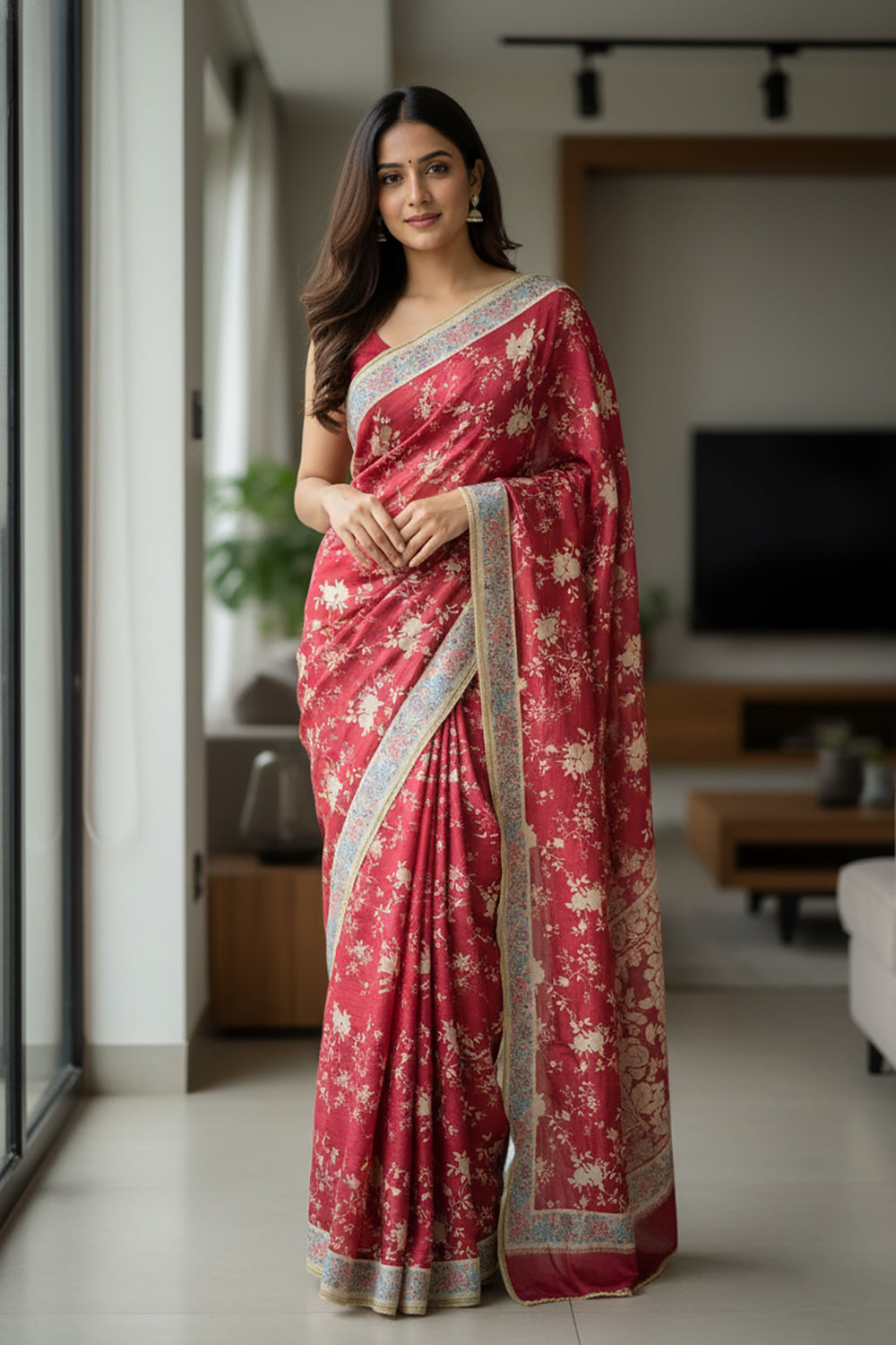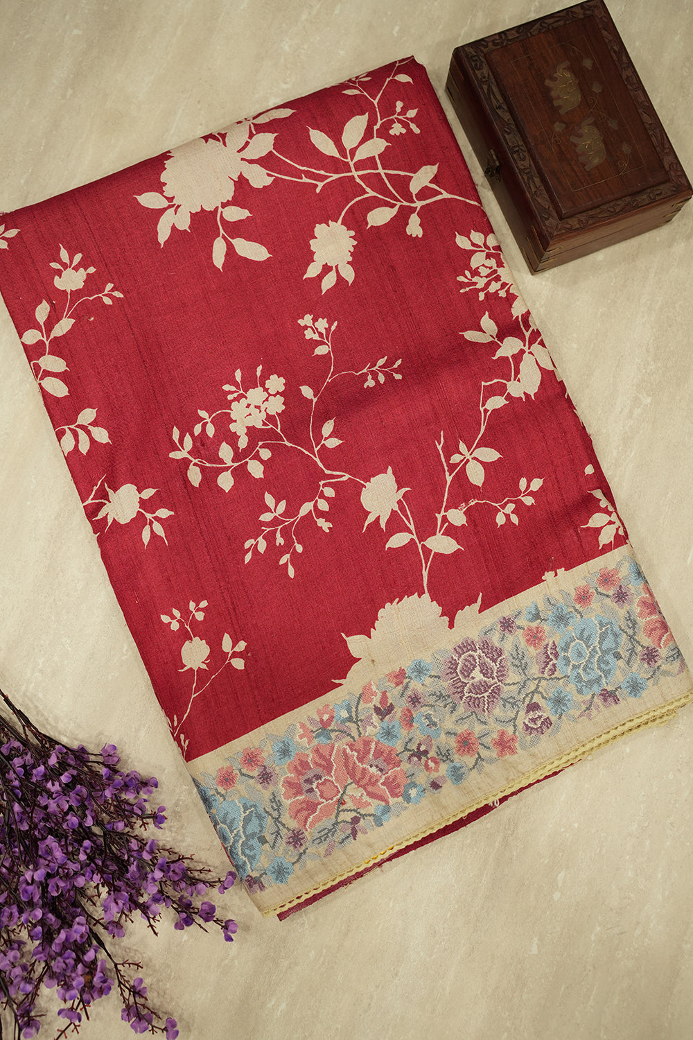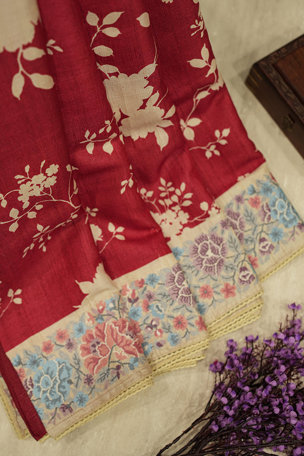 Maroon Tussar Silk Saree with Floral Border