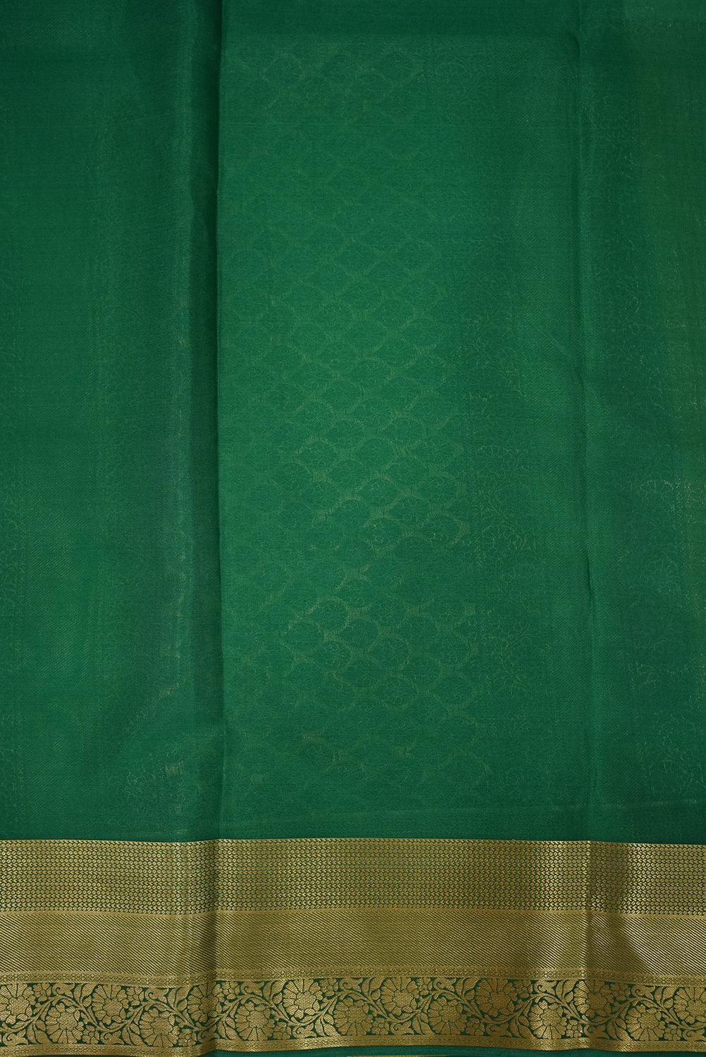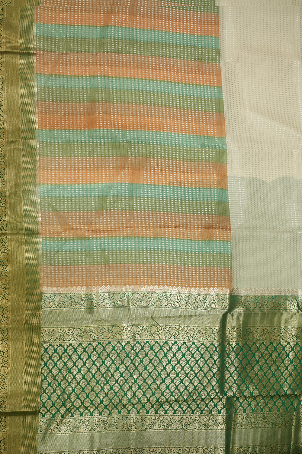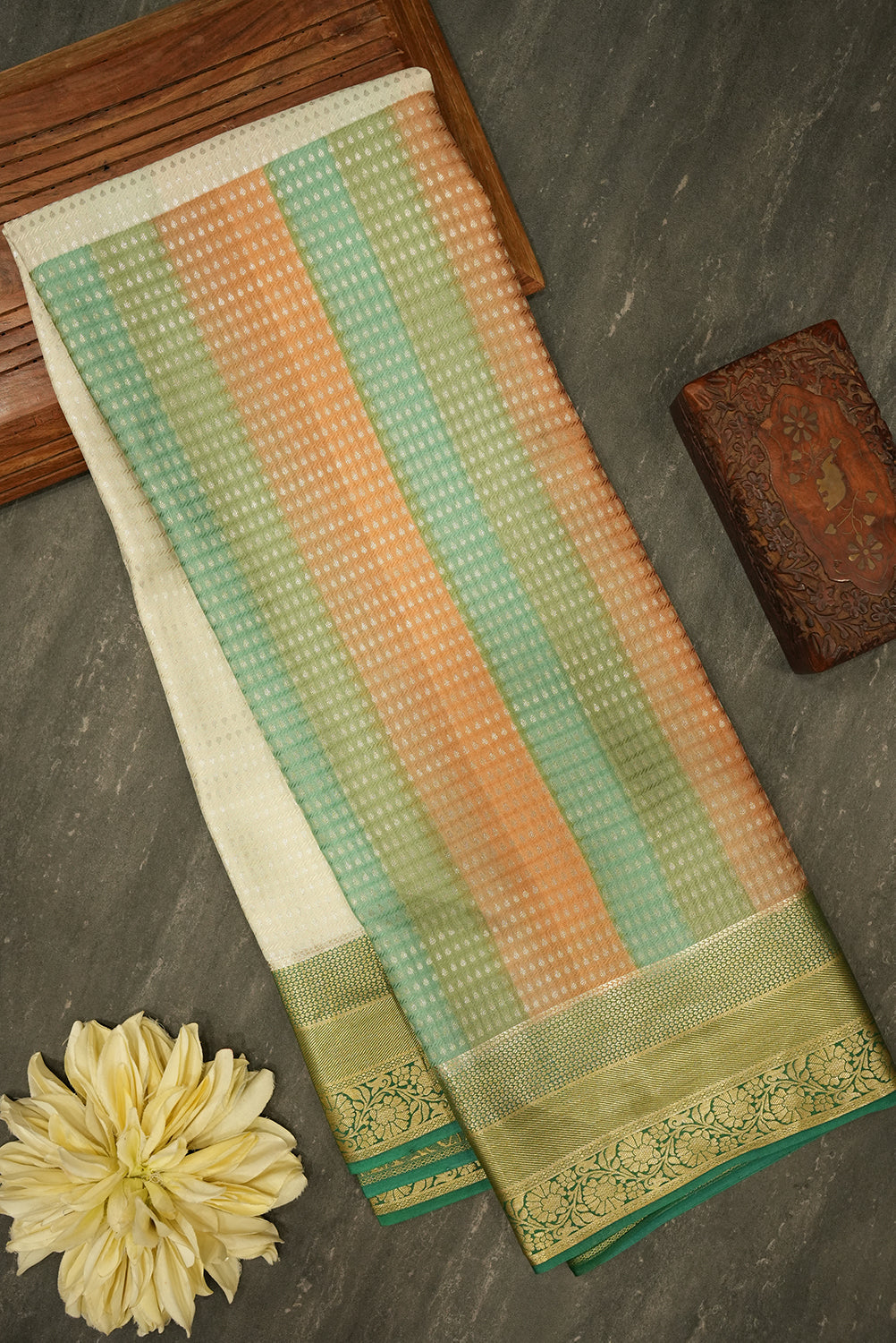 This exquisite Mysore silk saree features a sophisticated mix of colors, with stripes in soft off-white, light green, and peach. The body has a subtle woven checkered pattern, adding a touch of texture. The saree is finished with a stunning golden zari border and a solid dark green edge, providing a beautiful contrast. This lightweight and luxurious saree is perfect for festive occasions and special events, offering a modern twist on a classic design.