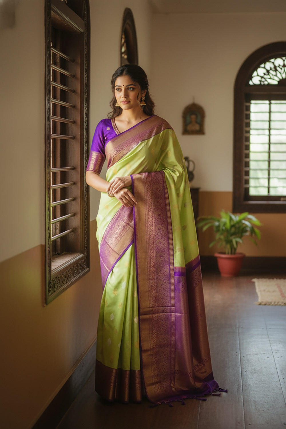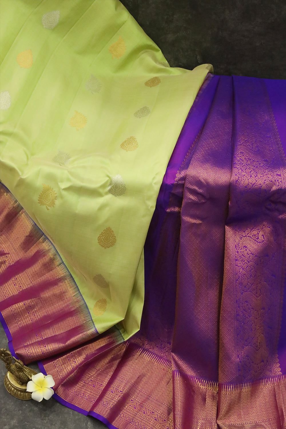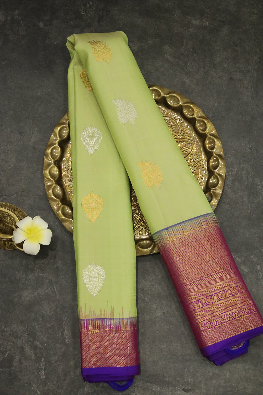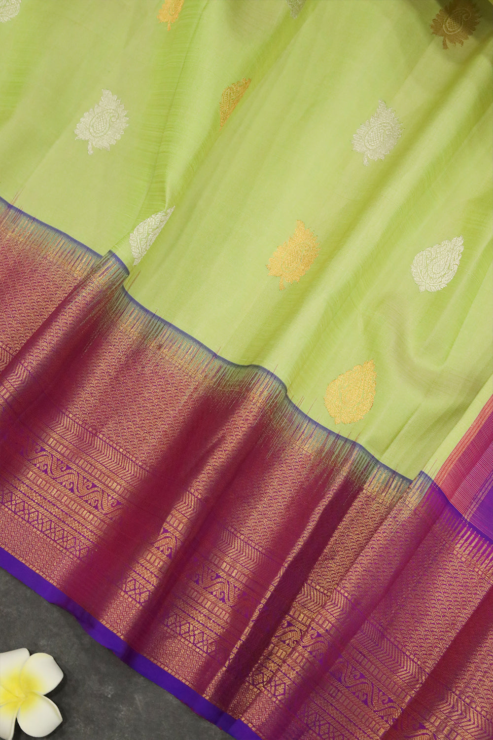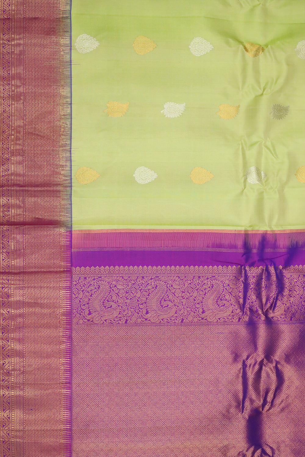Pastel Green Gadwal Silk Saree having a beautiful silver and gold zari leafs floral motifs all over the body with golden zari floral designs border. Included unstitched blouse